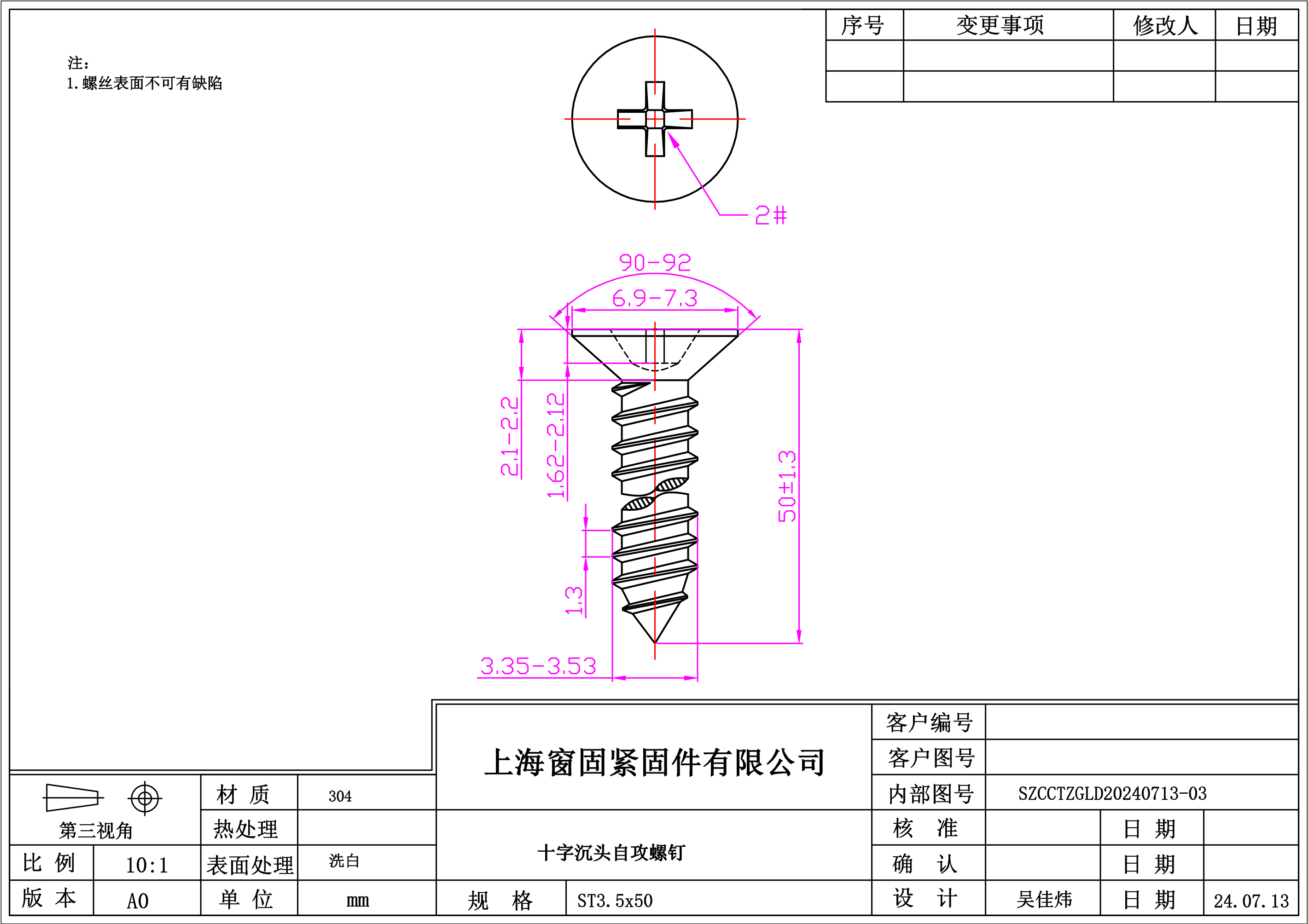 不锈钢304十字沉头自攻螺钉~3.5*50~洗白