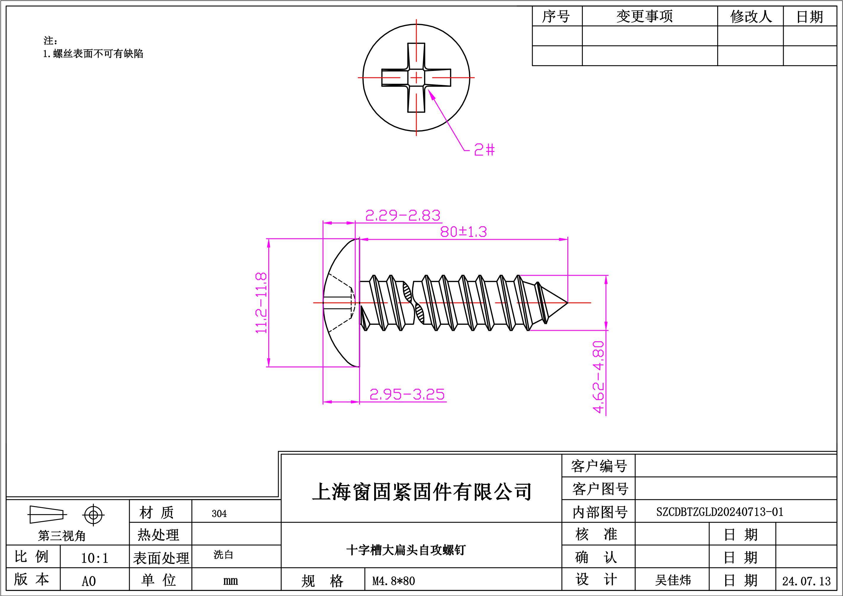 不锈钢304十字大扁头自攻螺钉~4.8*80~洗白