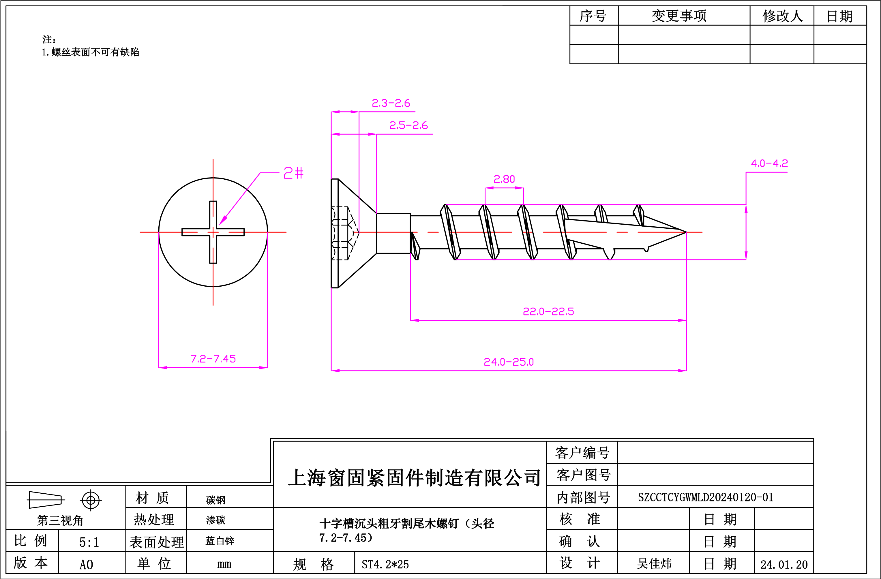 十字沉头粗牙割尾木螺钉~4.2*25~蓝白锌~(头径7.2-7.45)