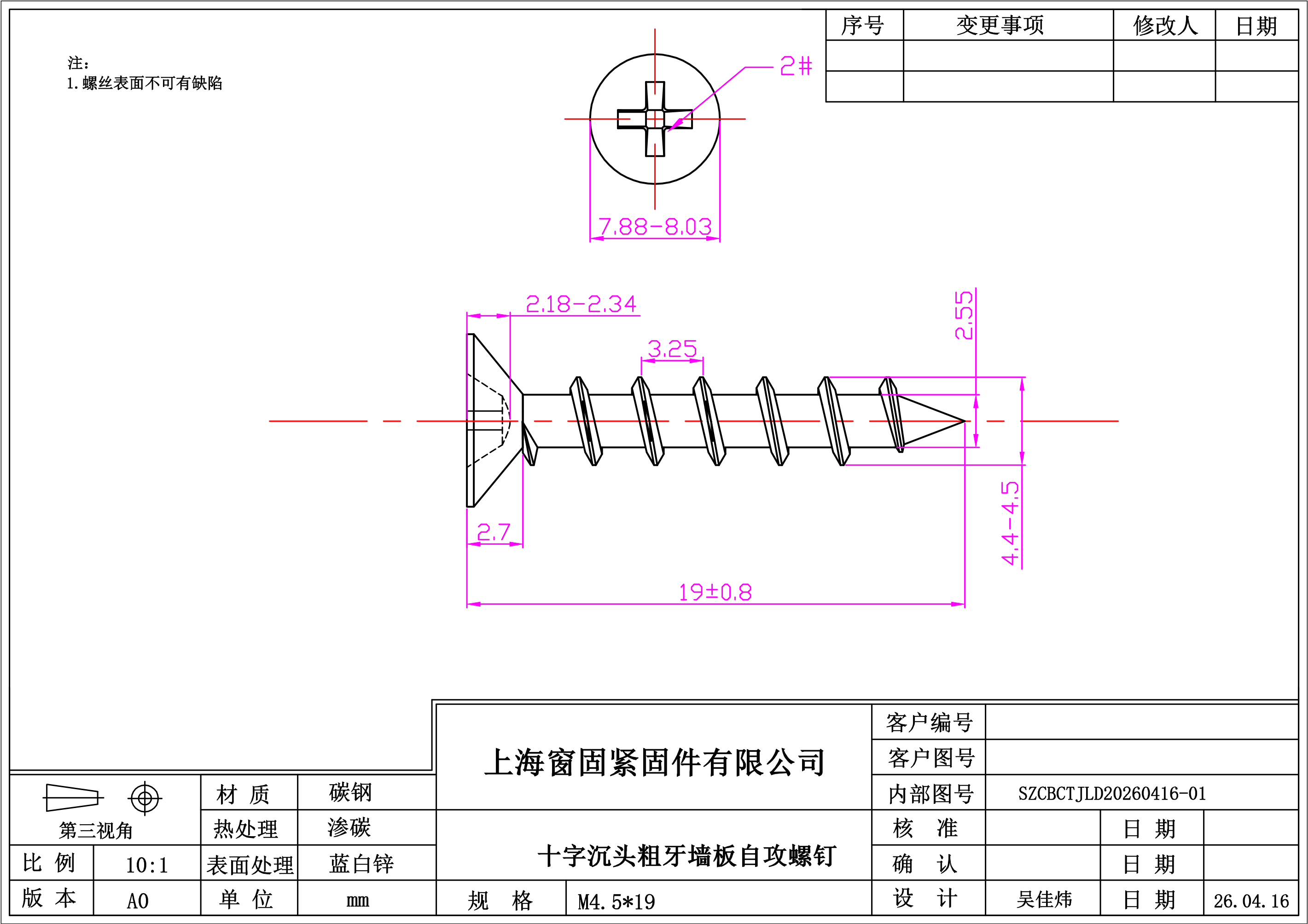 十字沉头粗牙墙板自攻钉~4.5*19~蓝白锌~(头径7.88-8.03)