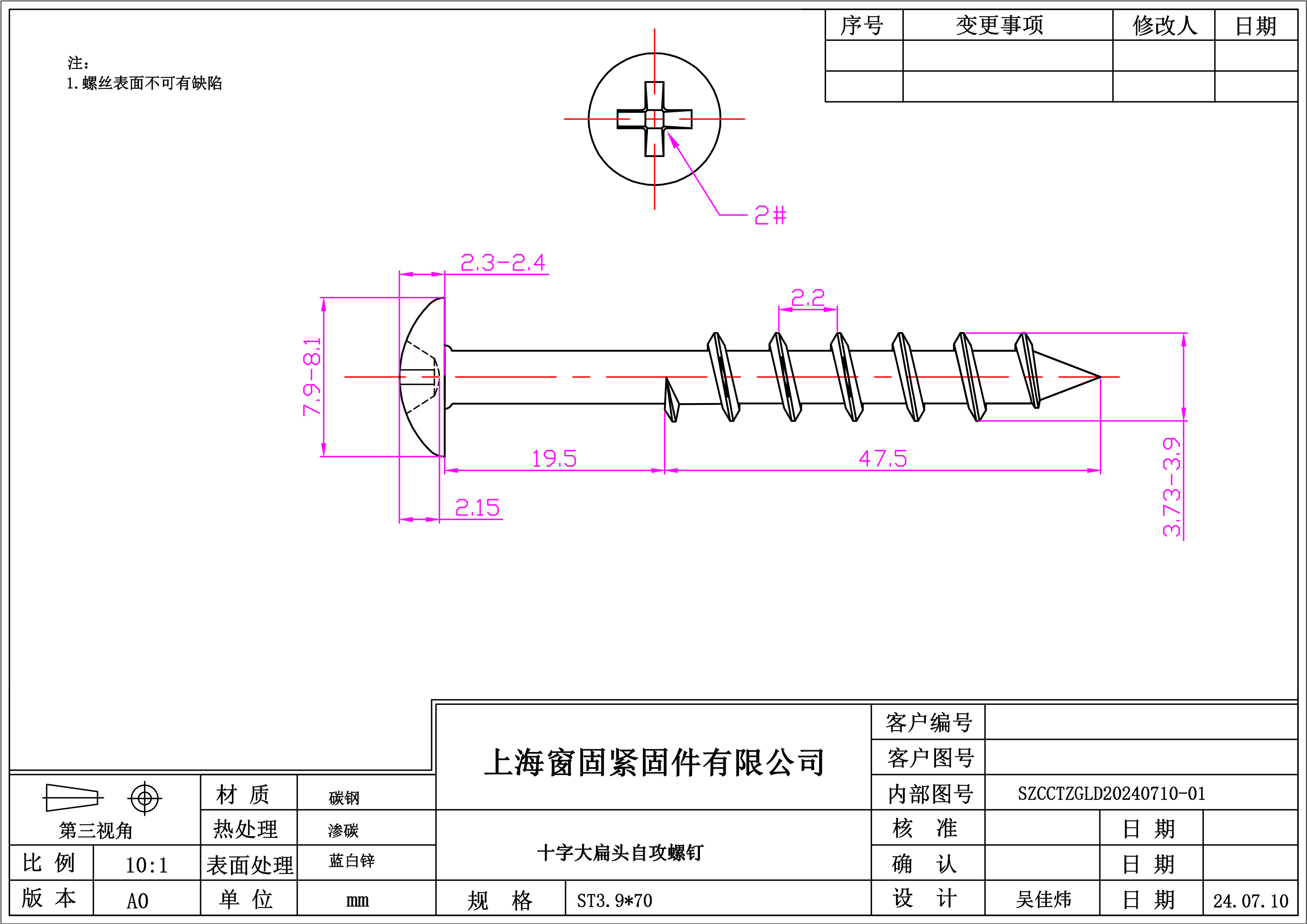 十字大扁头自攻螺钉~3.9*70~蓝白锌