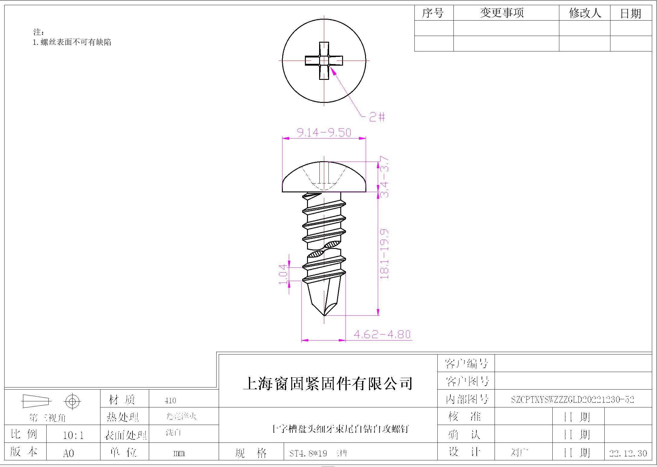 不锈钢410十字盘头细牙束尾自钻自攻螺钉~4.8*19~洗白~(三槽)