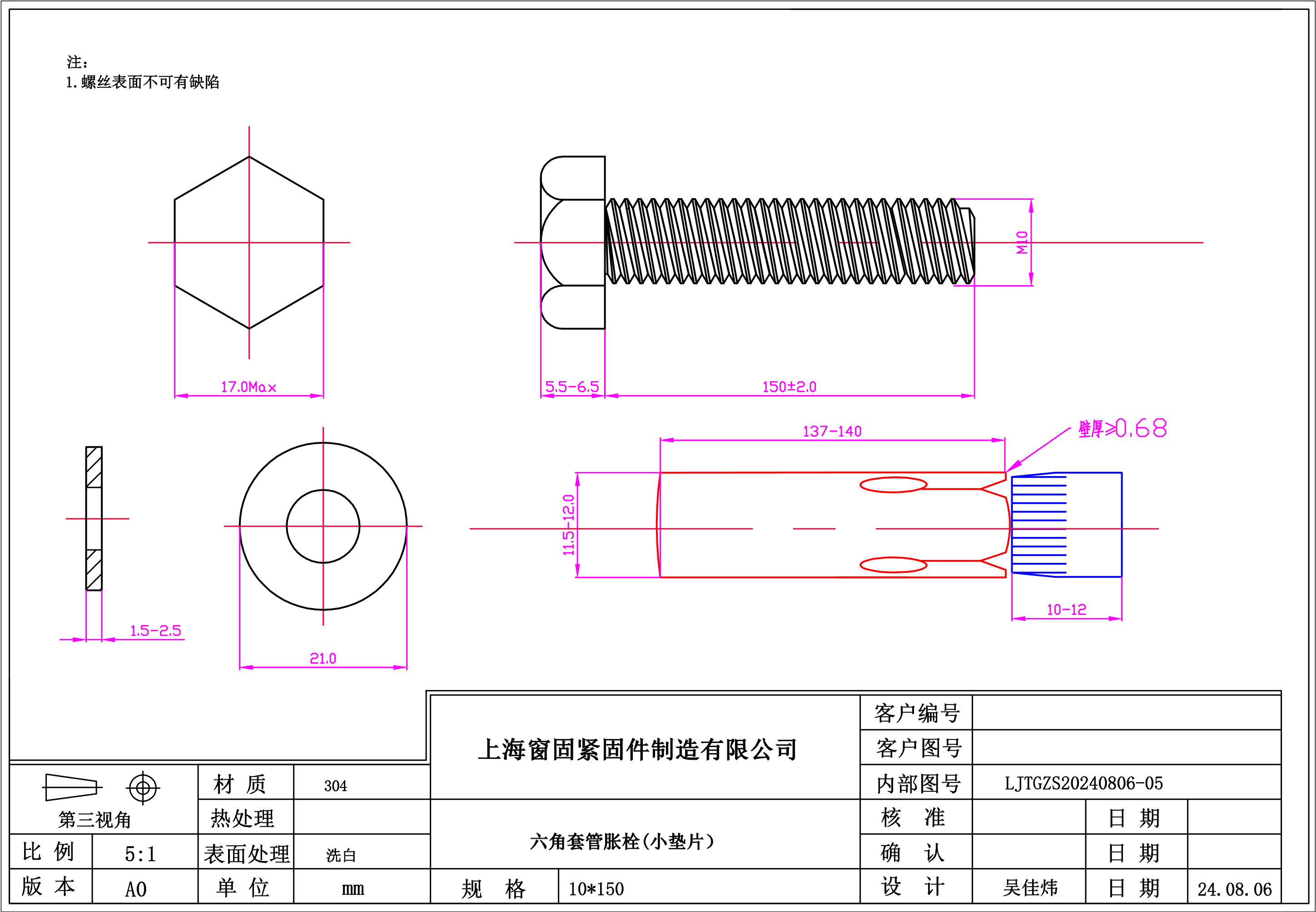 不锈钢304六角套管胀栓~10*150~洗白~(小垫片)