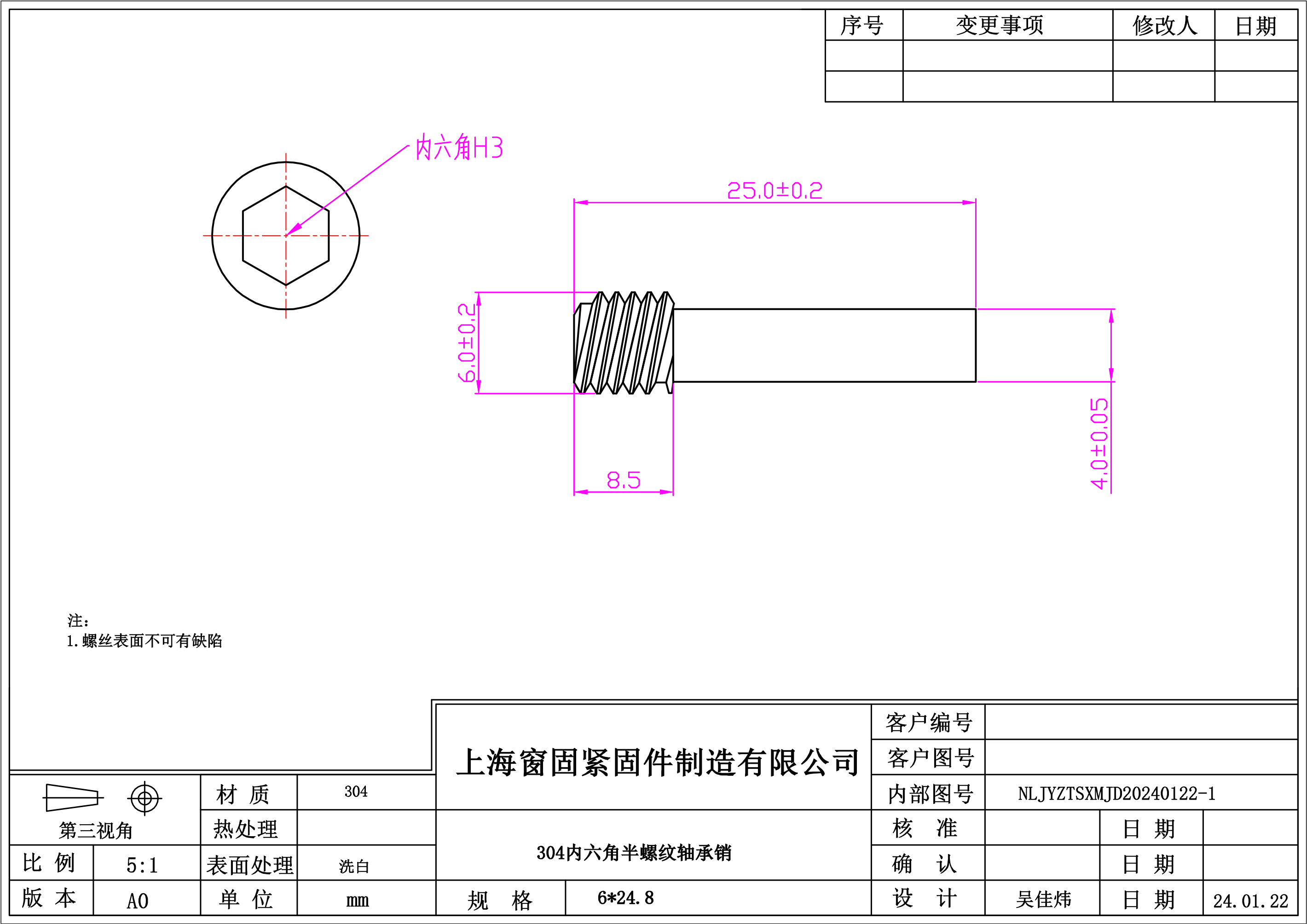 不锈钢304内六角半螺纹轴承销~6*24.8~洗白