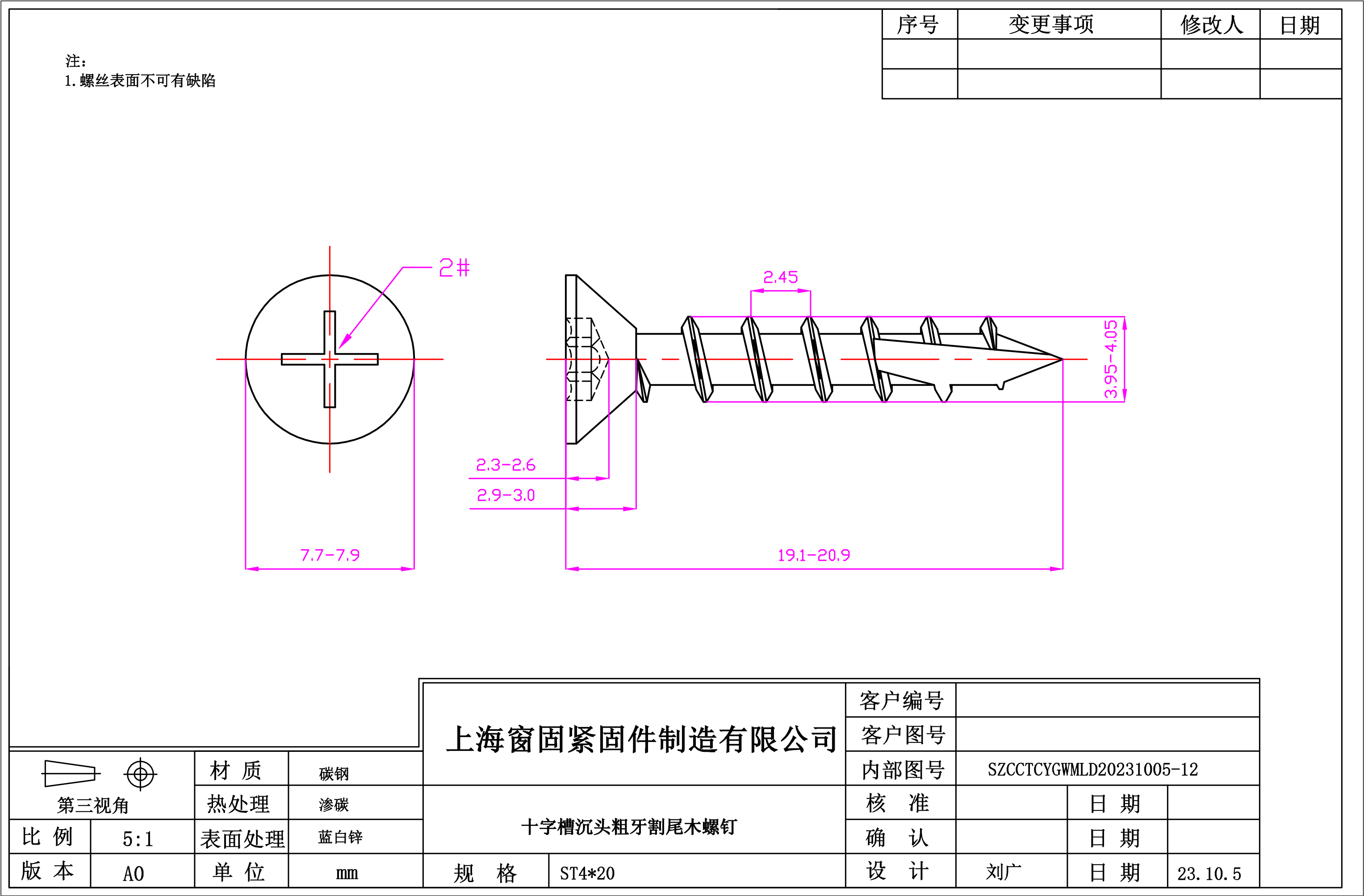 十字沉头粗牙割尾木螺钉~4*20~蓝白锌