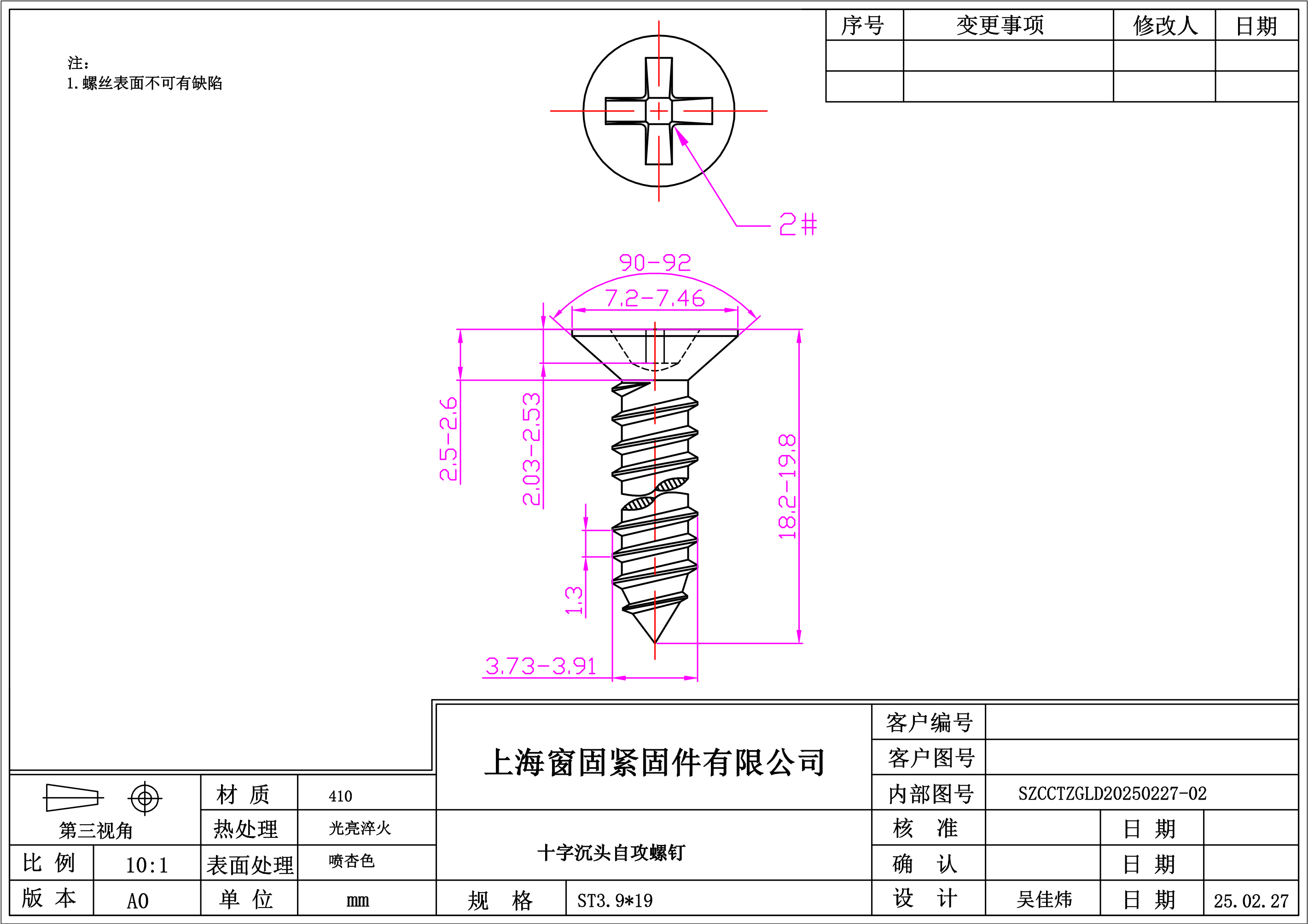 不锈钢410十字沉头自攻螺钉~3.9*19~喷杏色头