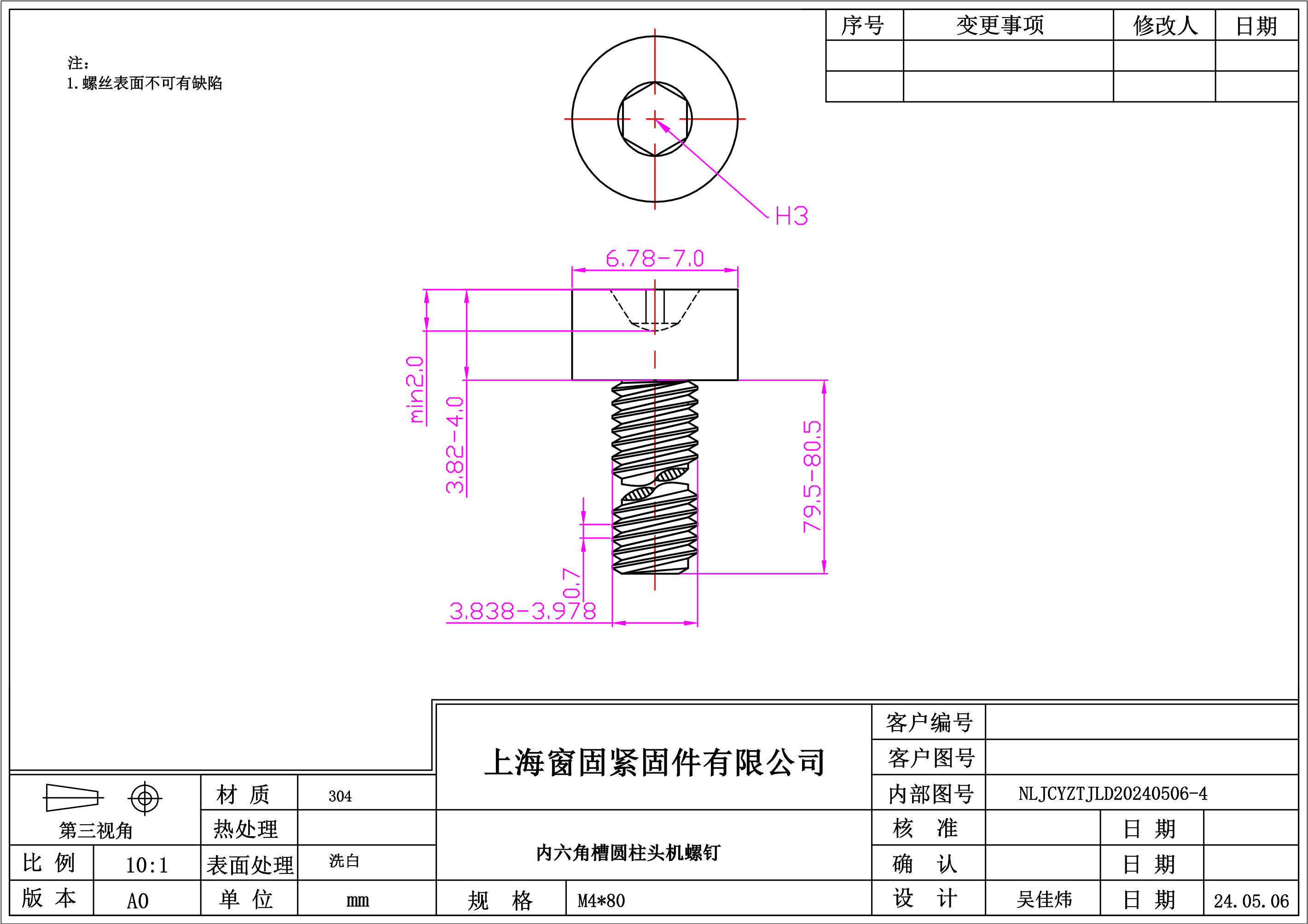 不锈钢304内六角圆柱头机螺钉~4*80~洗白
