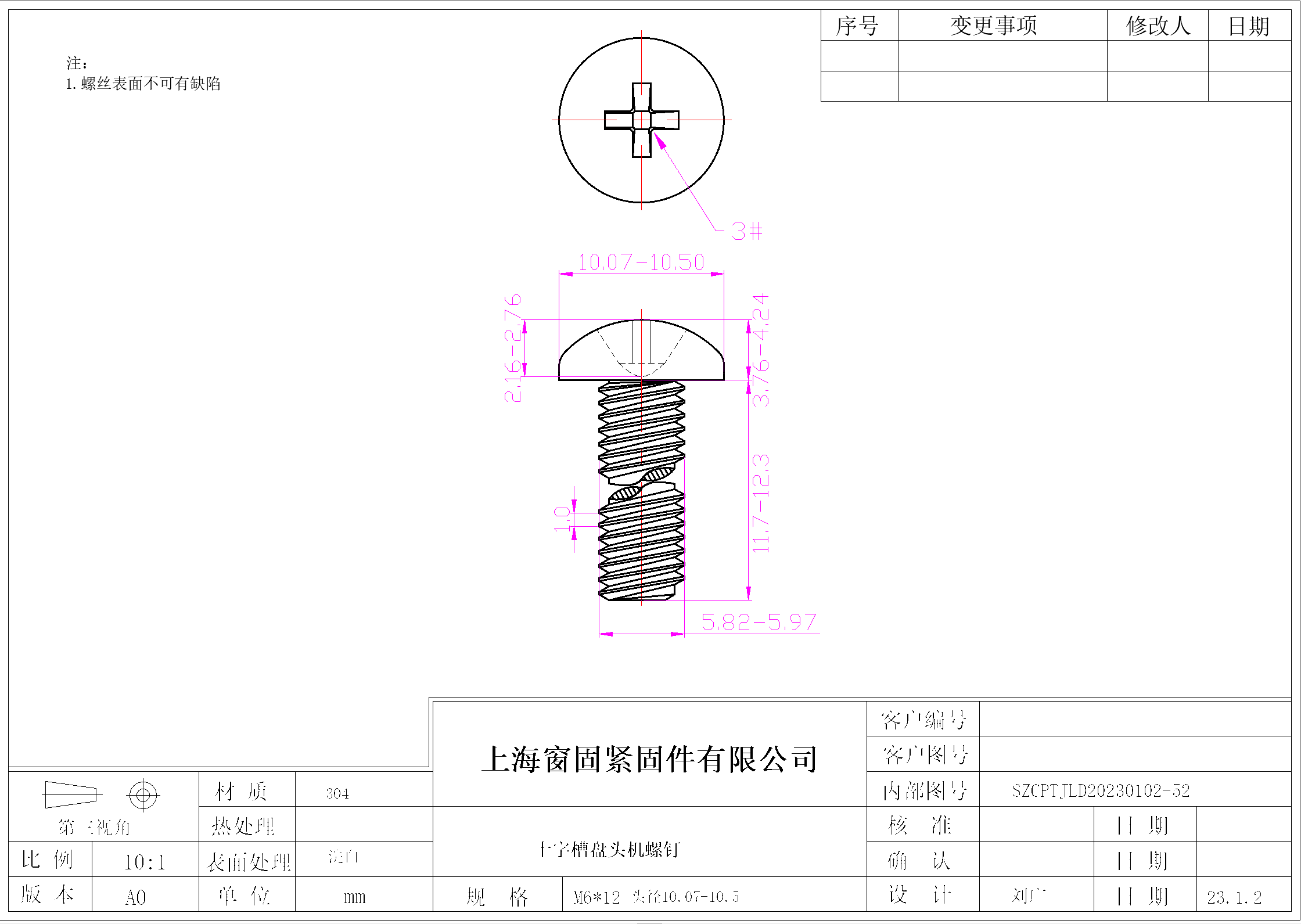 不锈钢304十字盘头机螺钉~6*12~(头径10.07-10.5)