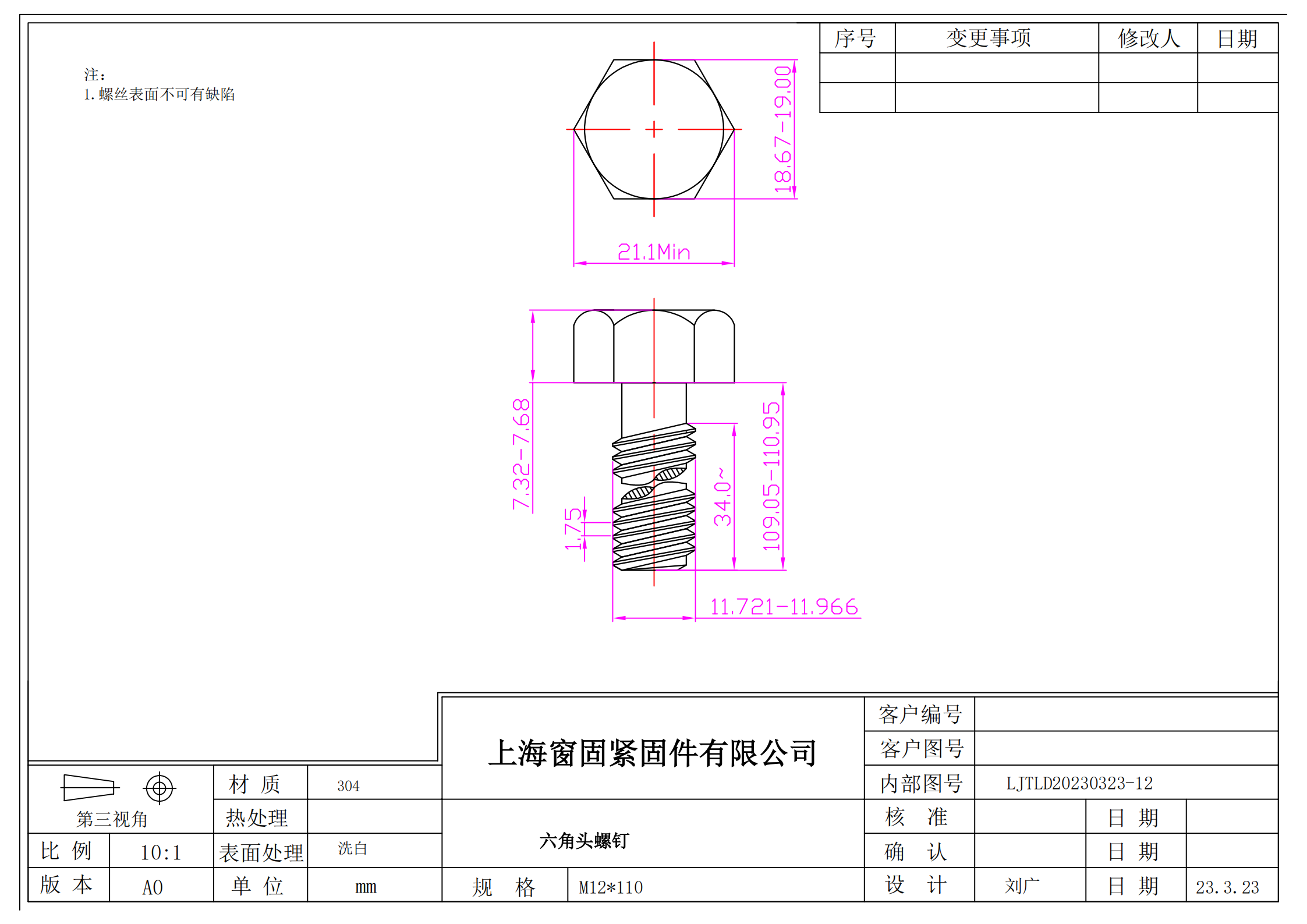 不锈钢304六角头螺栓~12*110~洗白~(牙长34)