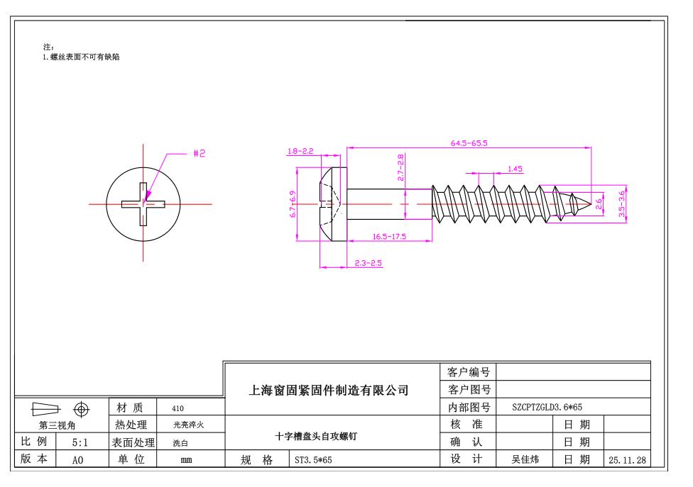 不锈钢410十字盘头自攻螺钉~3.5*65~洗白