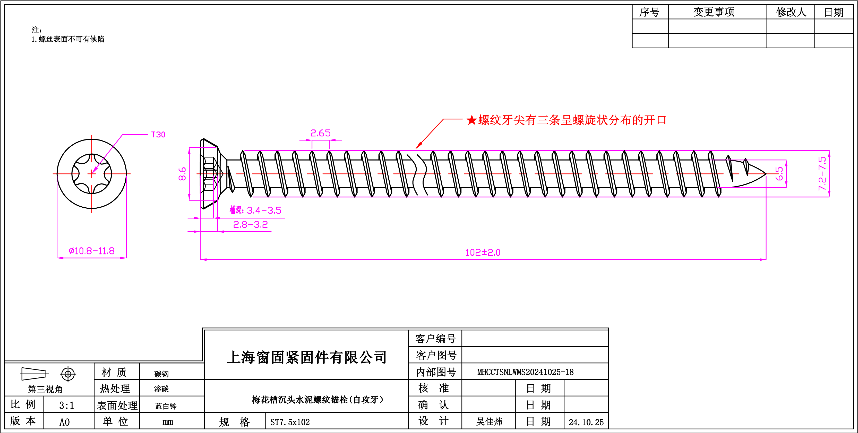 梅花沉头水泥螺纹锚栓~7.5*102~蓝白锌~(自攻牙,线径5.6)