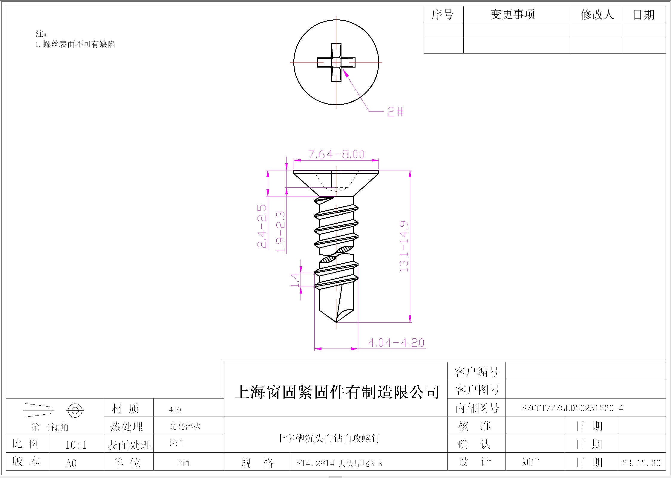 不锈钢410十字沉头自钻自攻螺钉~4.2*14~洗白~(大头厚尾3.3)