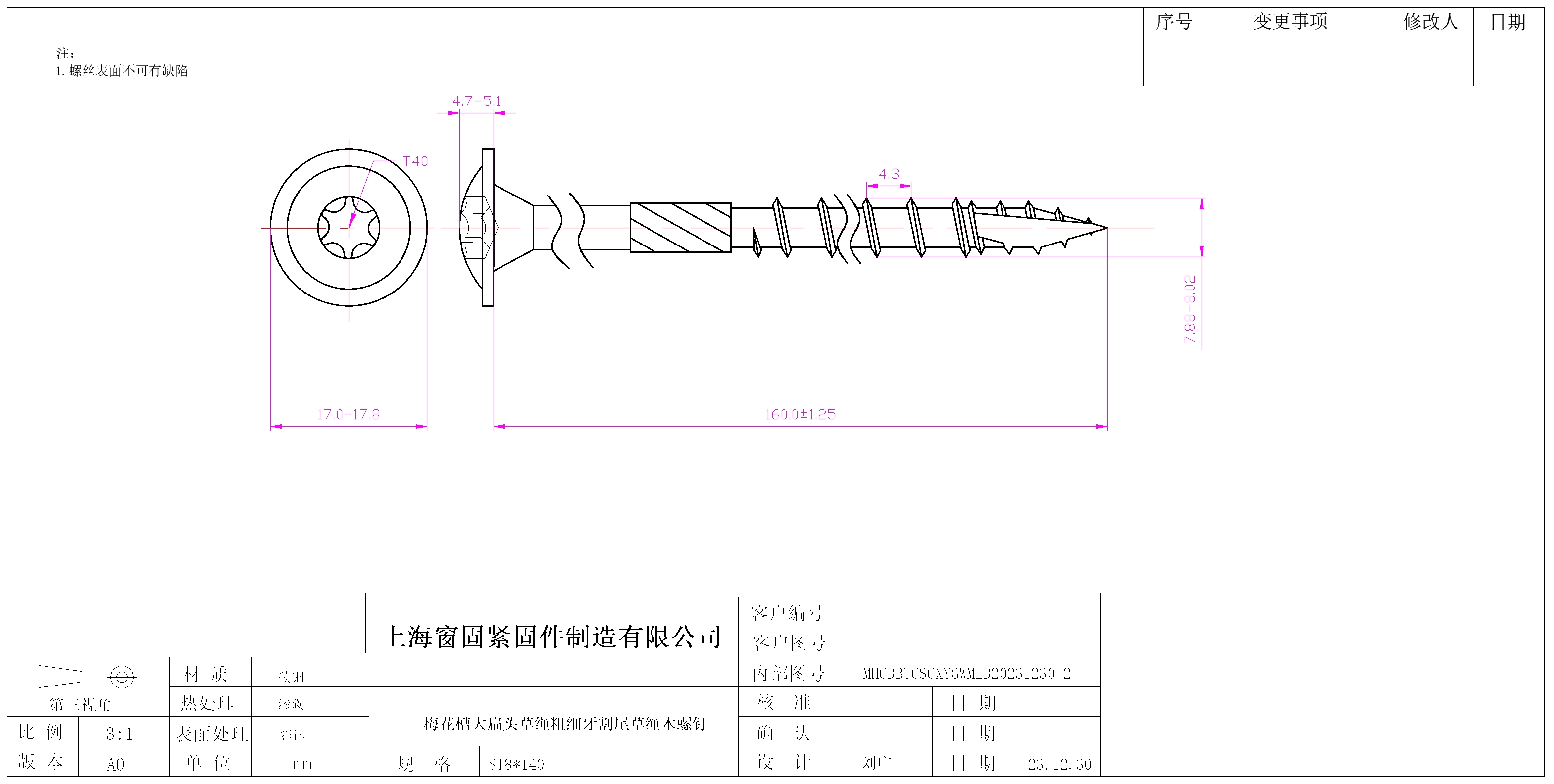 梅花大扁头草绳割尾木螺钉~8*140~五彩锌