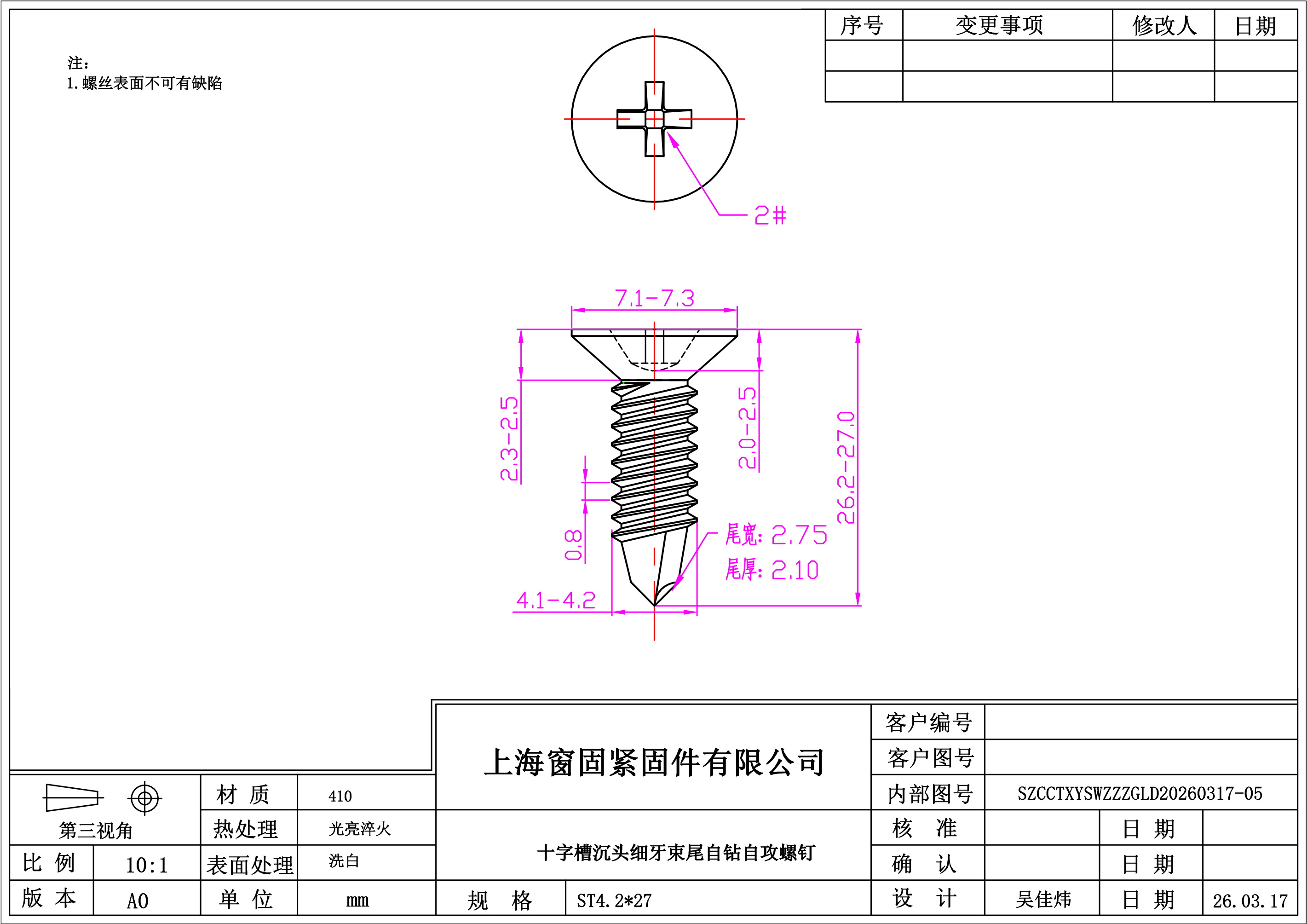 不锈钢410十字沉头细牙束尾自钻自攻螺钉~4.2*27~洗白