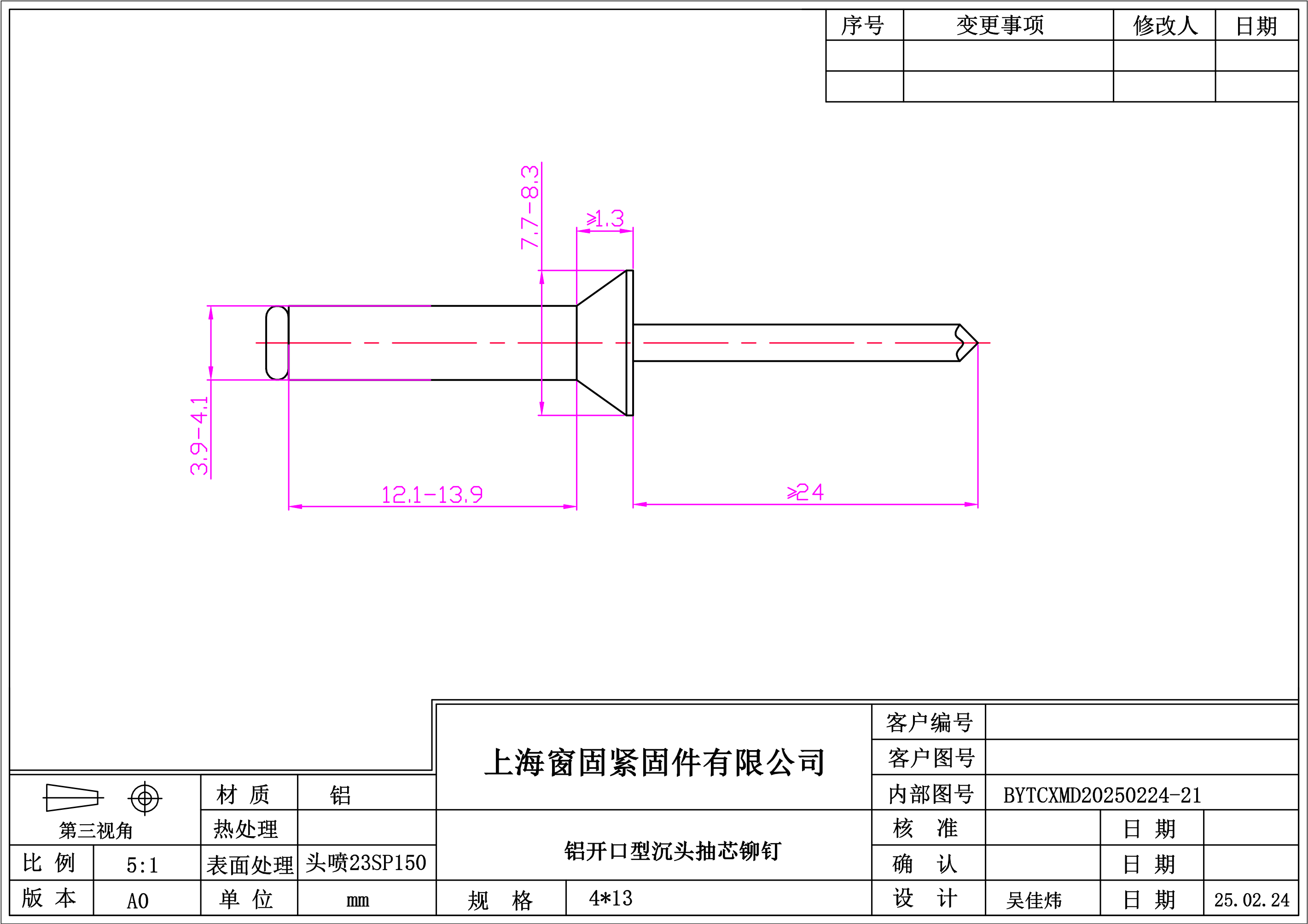 铝开口型扁圆头抽芯铆钉~4*13~头喷23SP150色