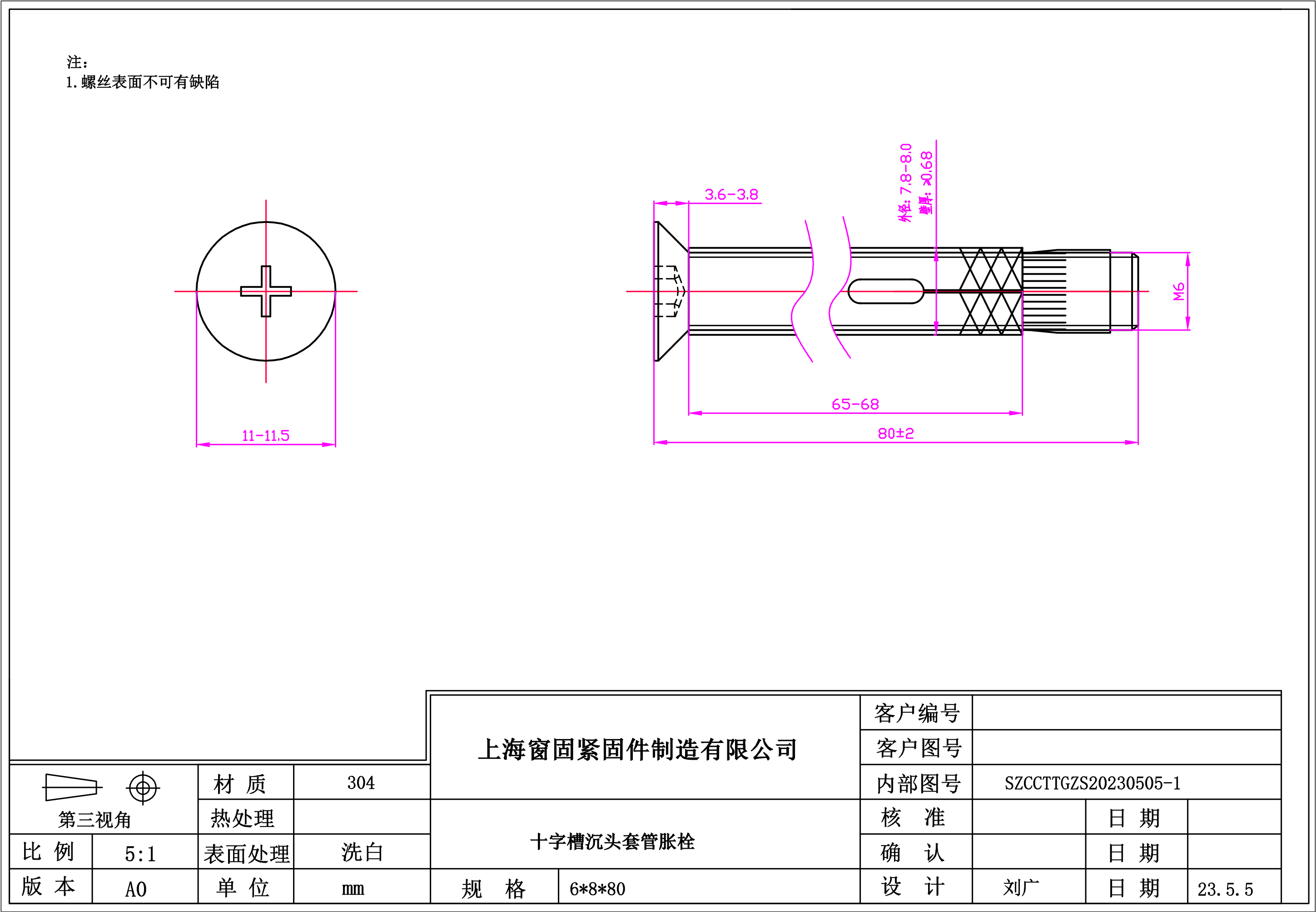 不锈钢304十字沉头套管胀栓~6*8*80~洗白~YP
