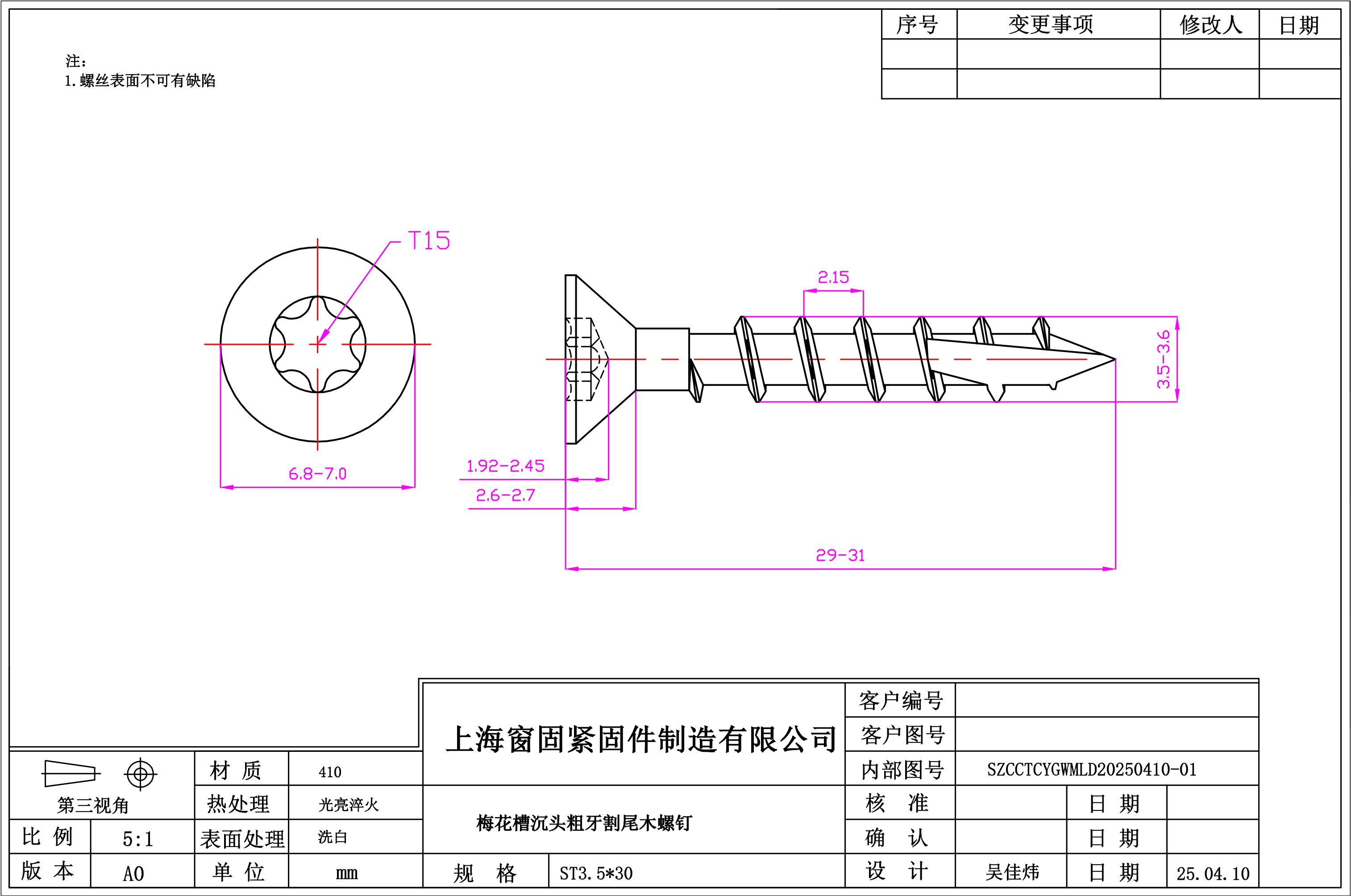 不锈钢410梅花沉头粗牙割尾木螺钉~3.5*30~洗白