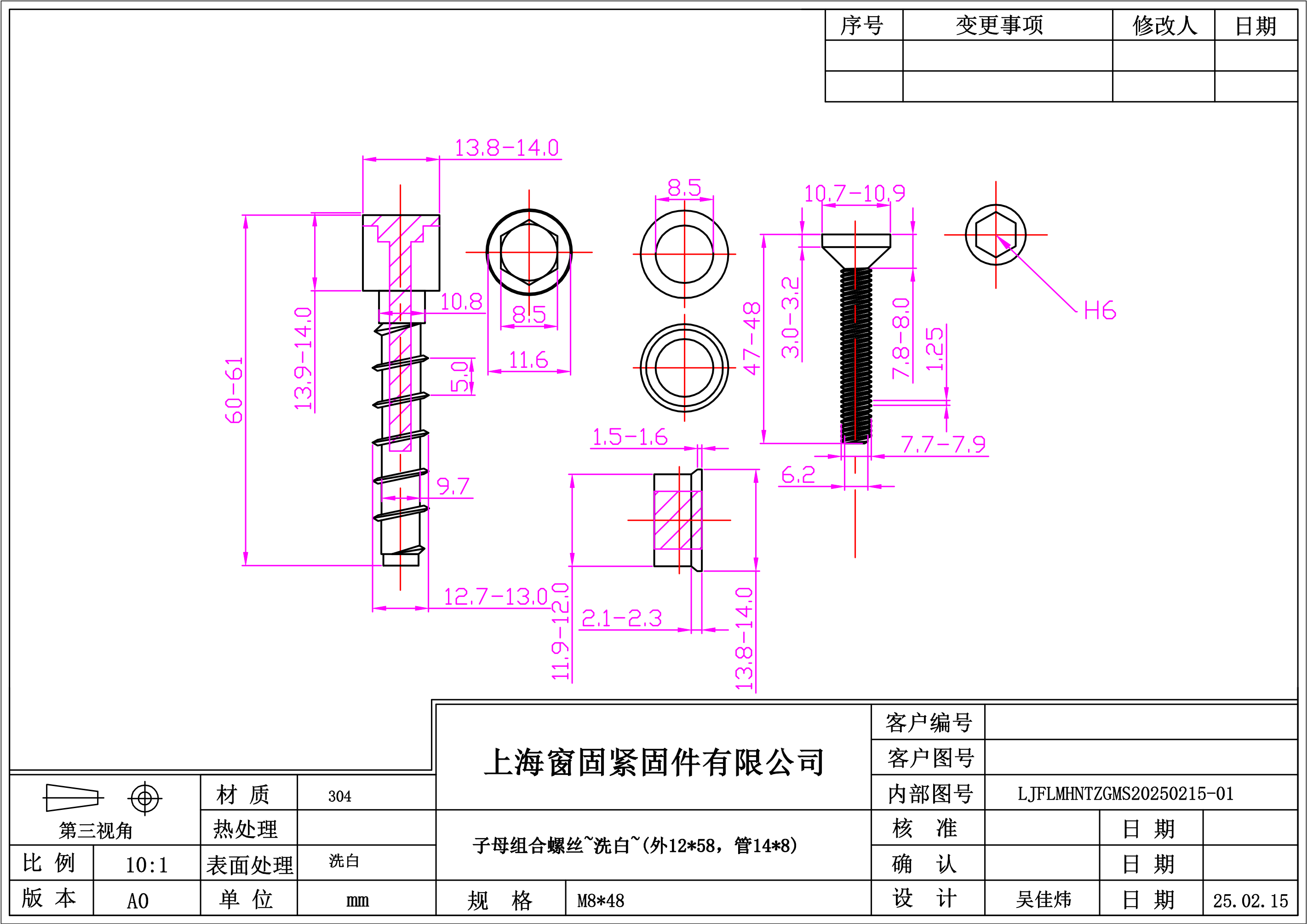 不锈钢304割槽组合螺钉~8*48~洗白~(外12*58,M8*48,管14*8)