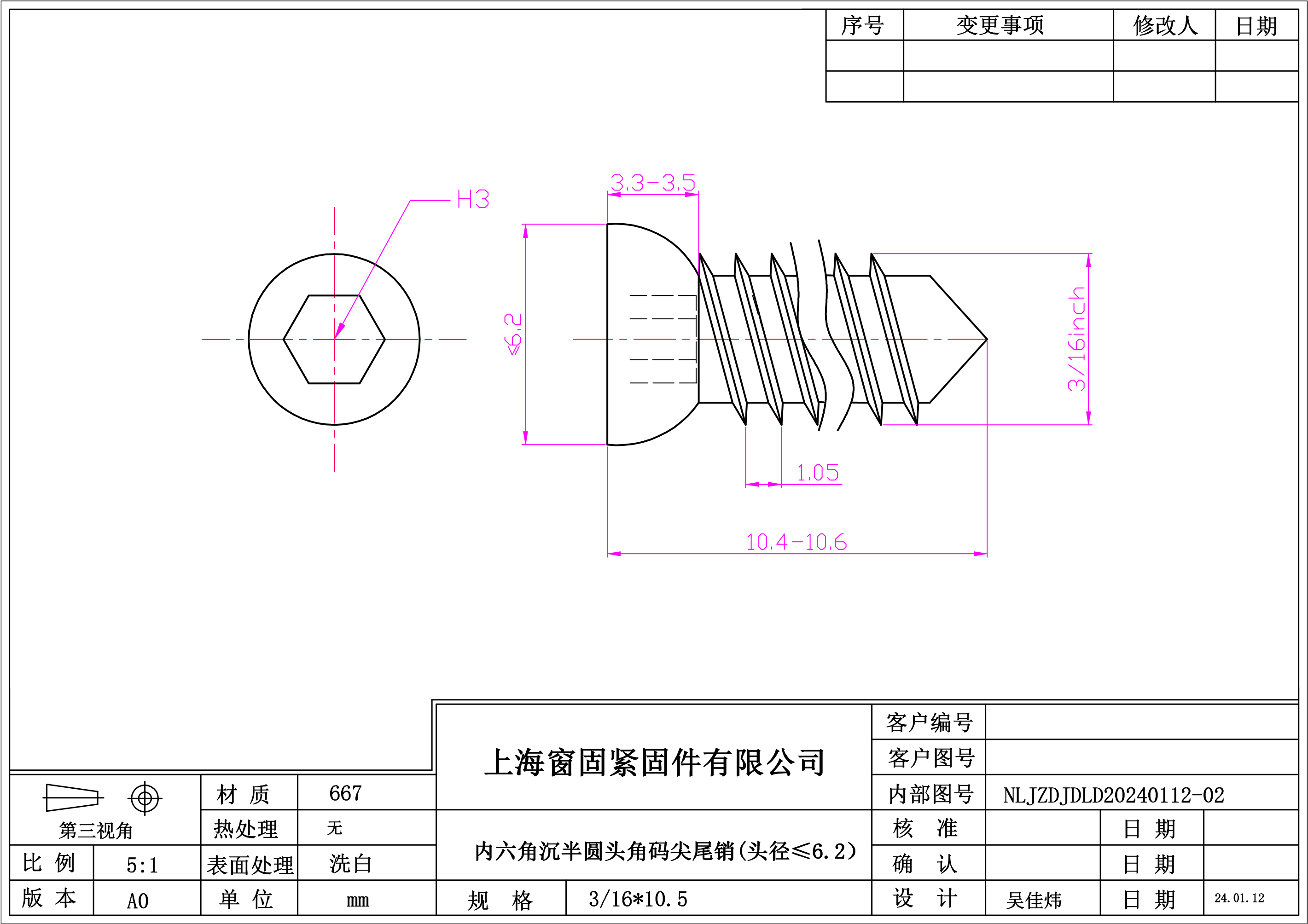 不锈钢667内六角沉半圆头角码销~3/16*10.5~洗白~(头径≤6.2,尖尾)