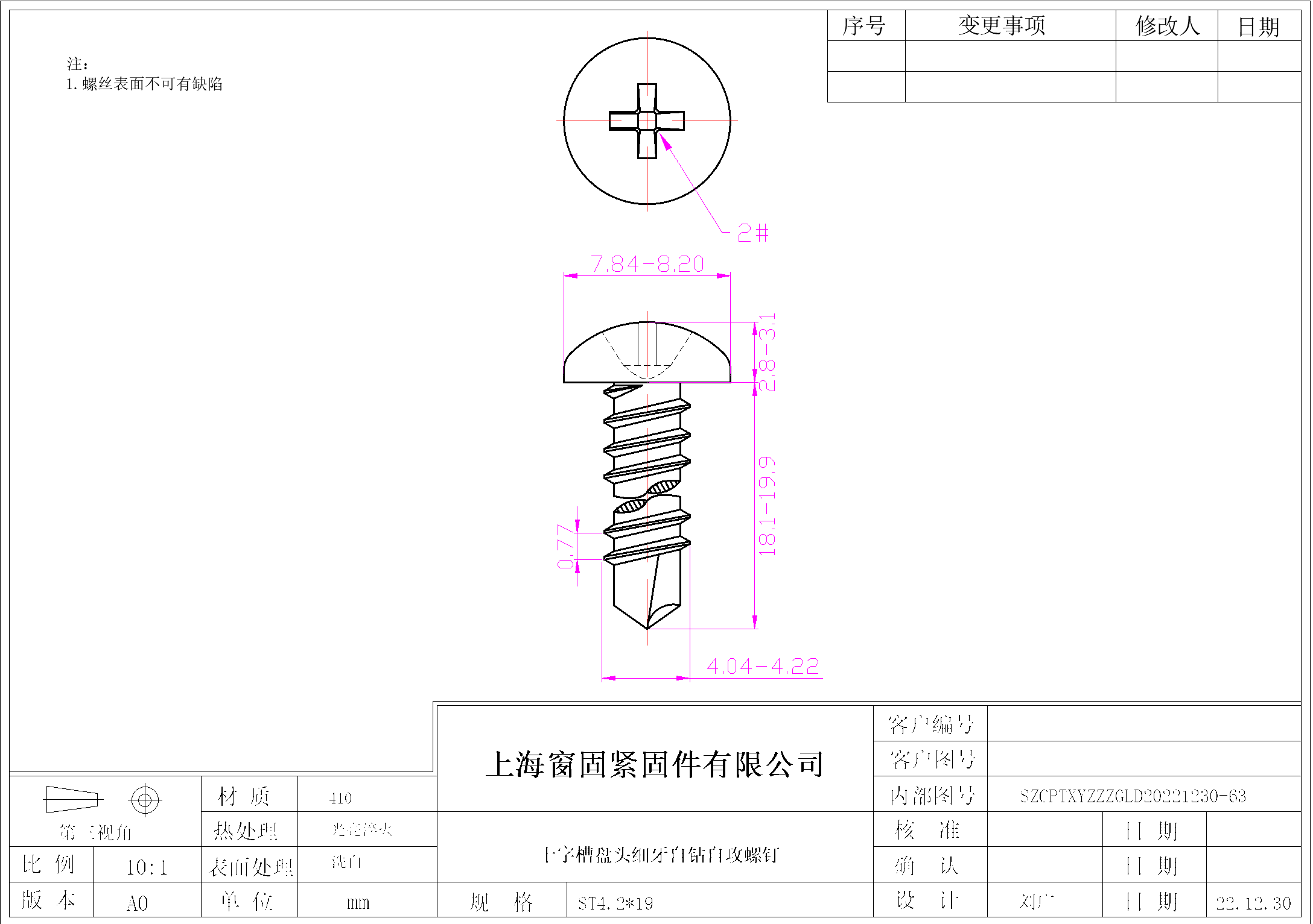 不锈钢410十字盘头细牙自钻自攻螺钉~4.2*19~洗白