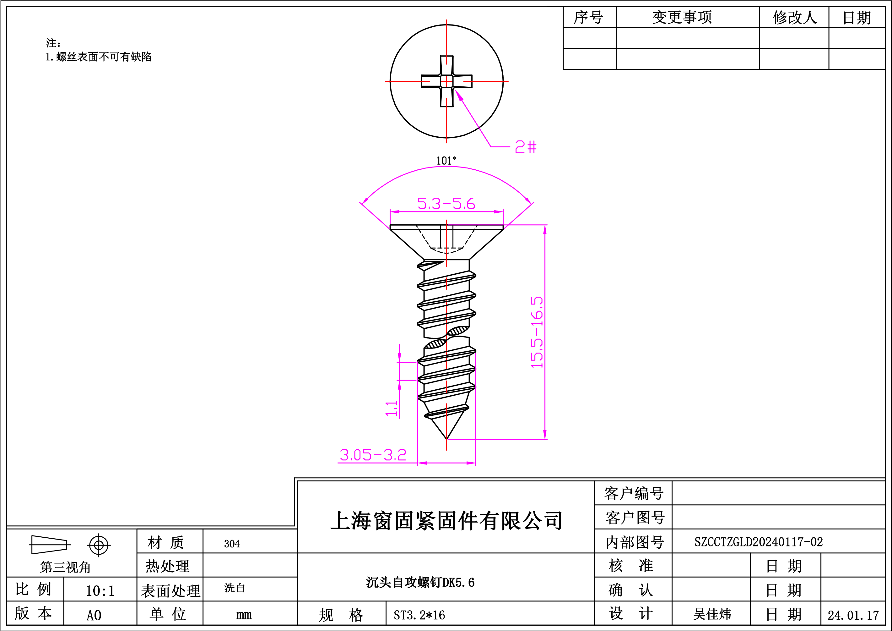 不锈钢304十字沉头自攻螺钉~3.2*16~洗白~(101度沉头)