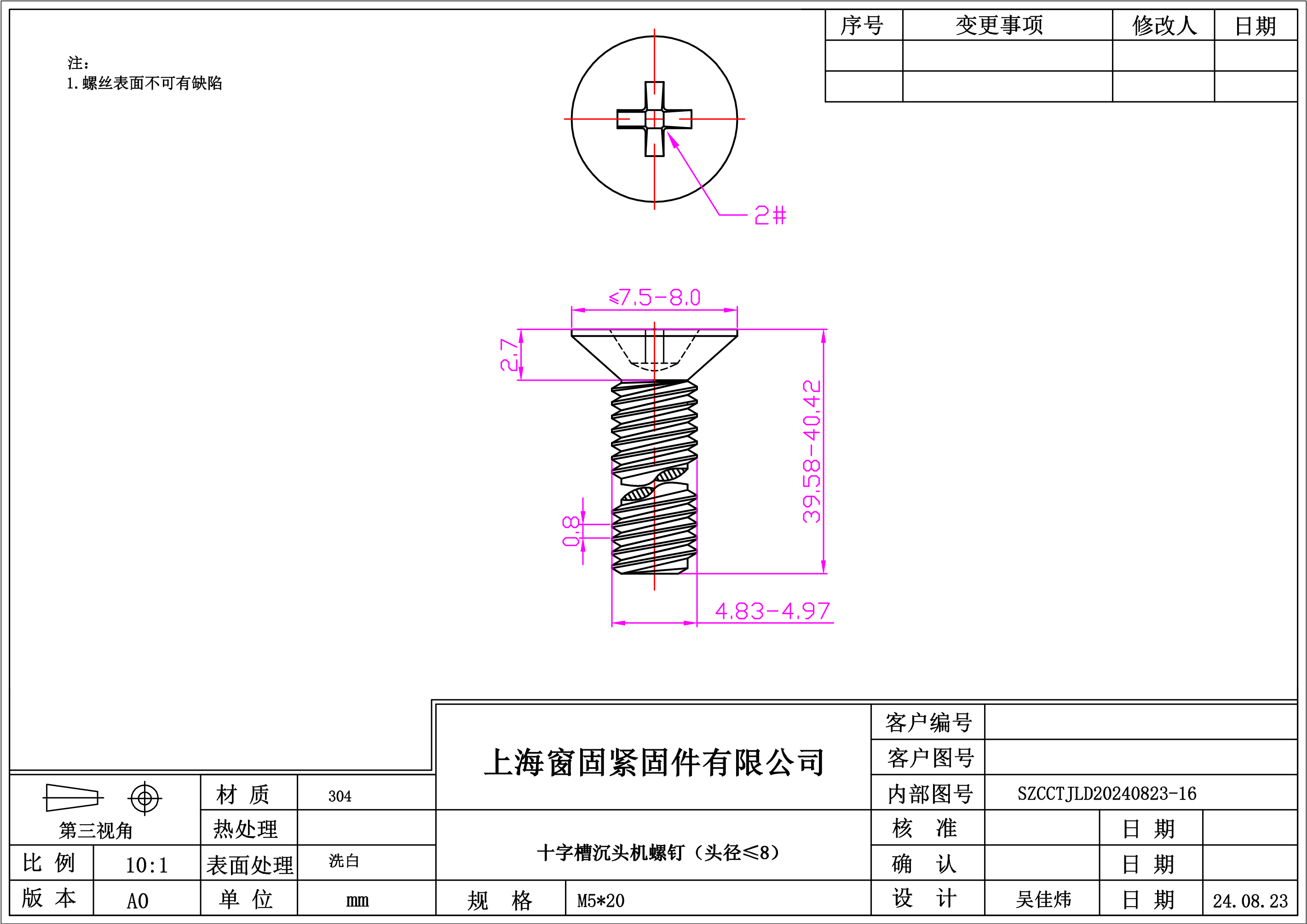 不锈钢304十字沉头机螺钉~5*40~洗白~(头径7.5-8.0)
