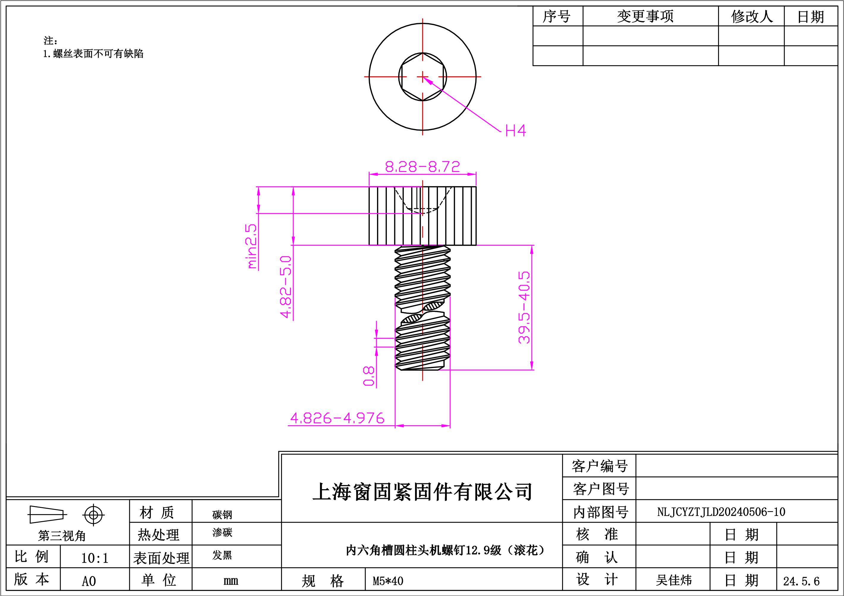 碳钢内六角圆柱头机螺钉~5*40~12.9级~发黑~(滚花)