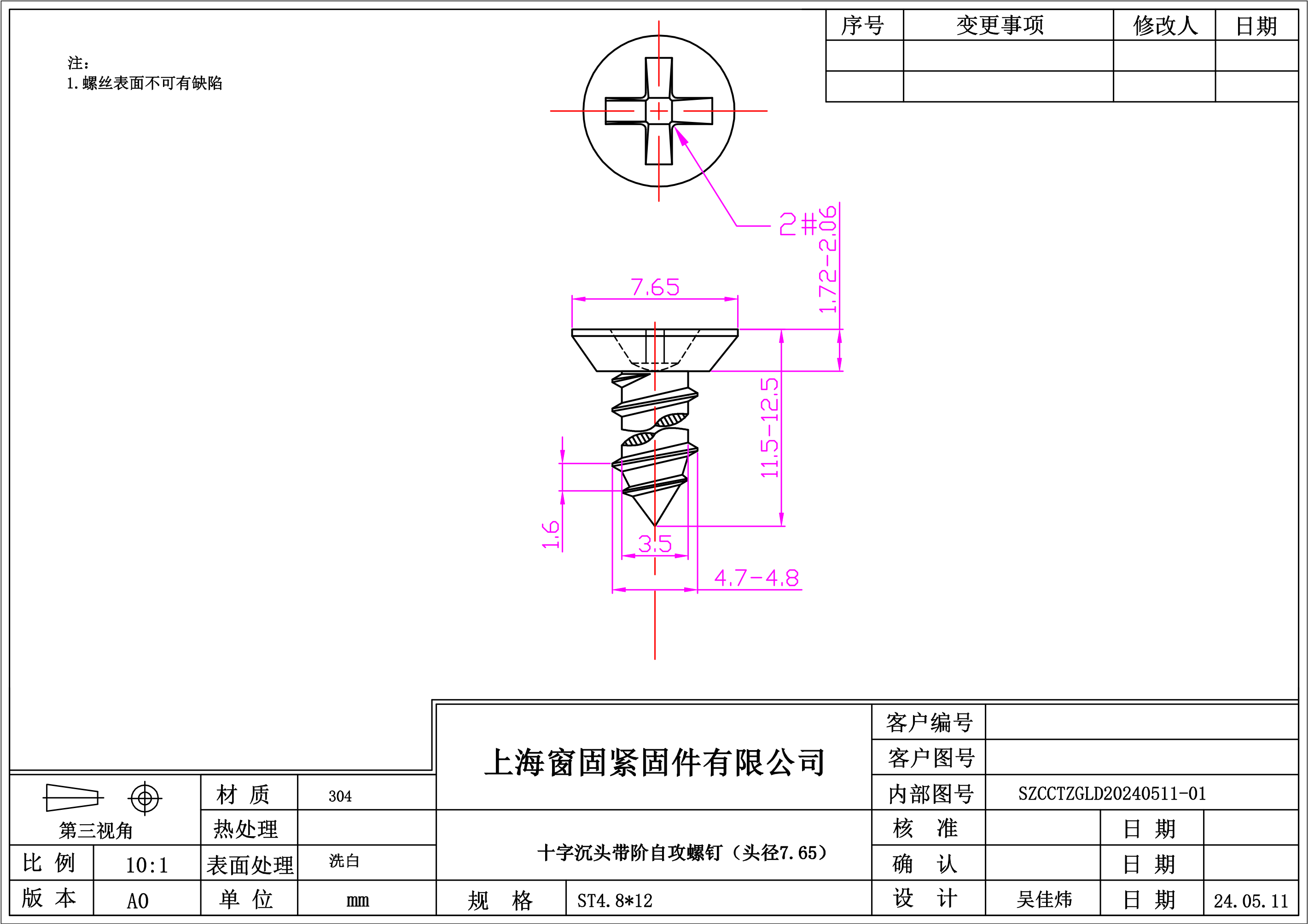 不锈钢304十字沉头带阶自攻螺钉~4.8*12~洗白~(头径7.65)