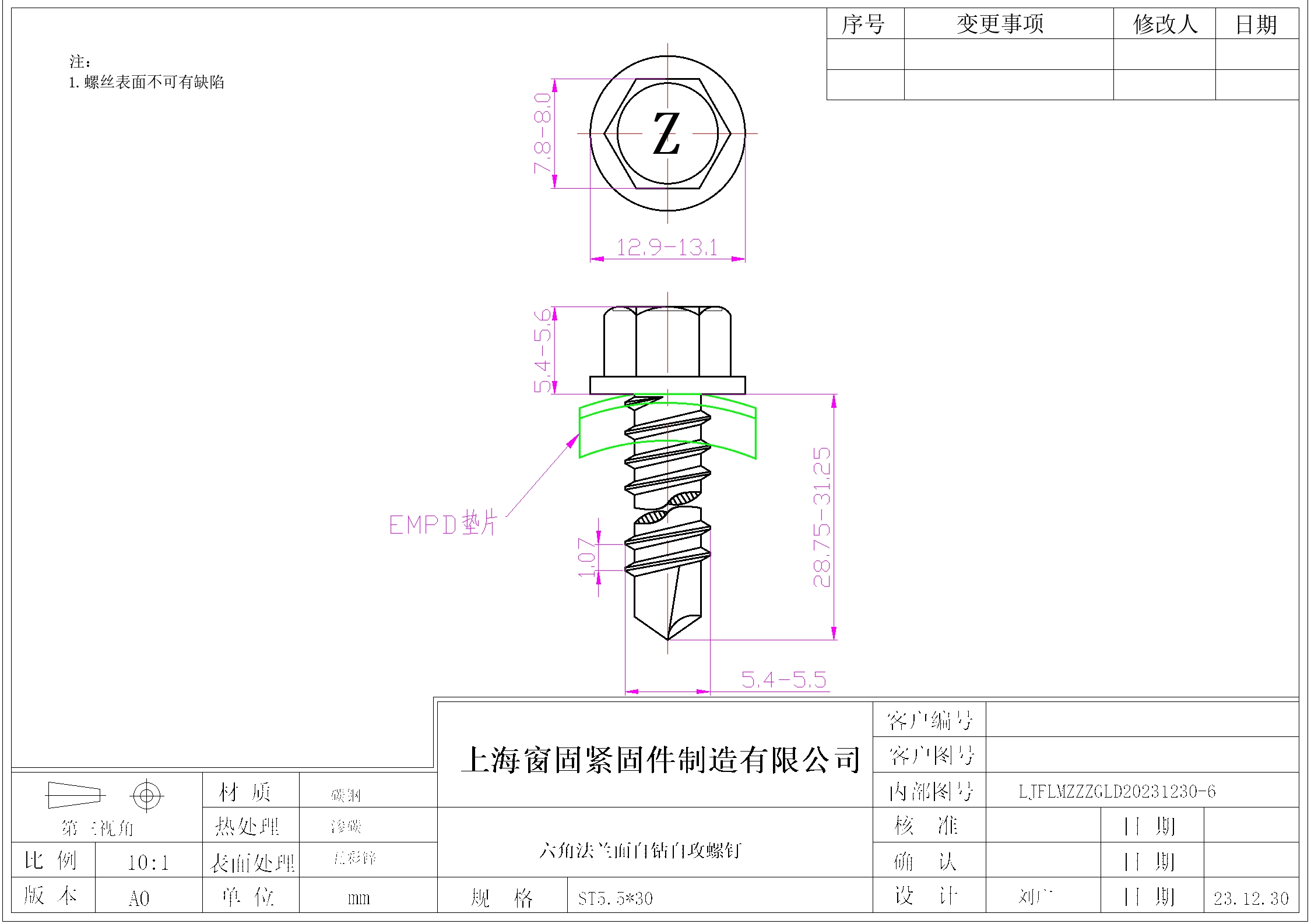 六角法兰面自钻自攻螺钉~5.5*30~五彩锌~(Z)