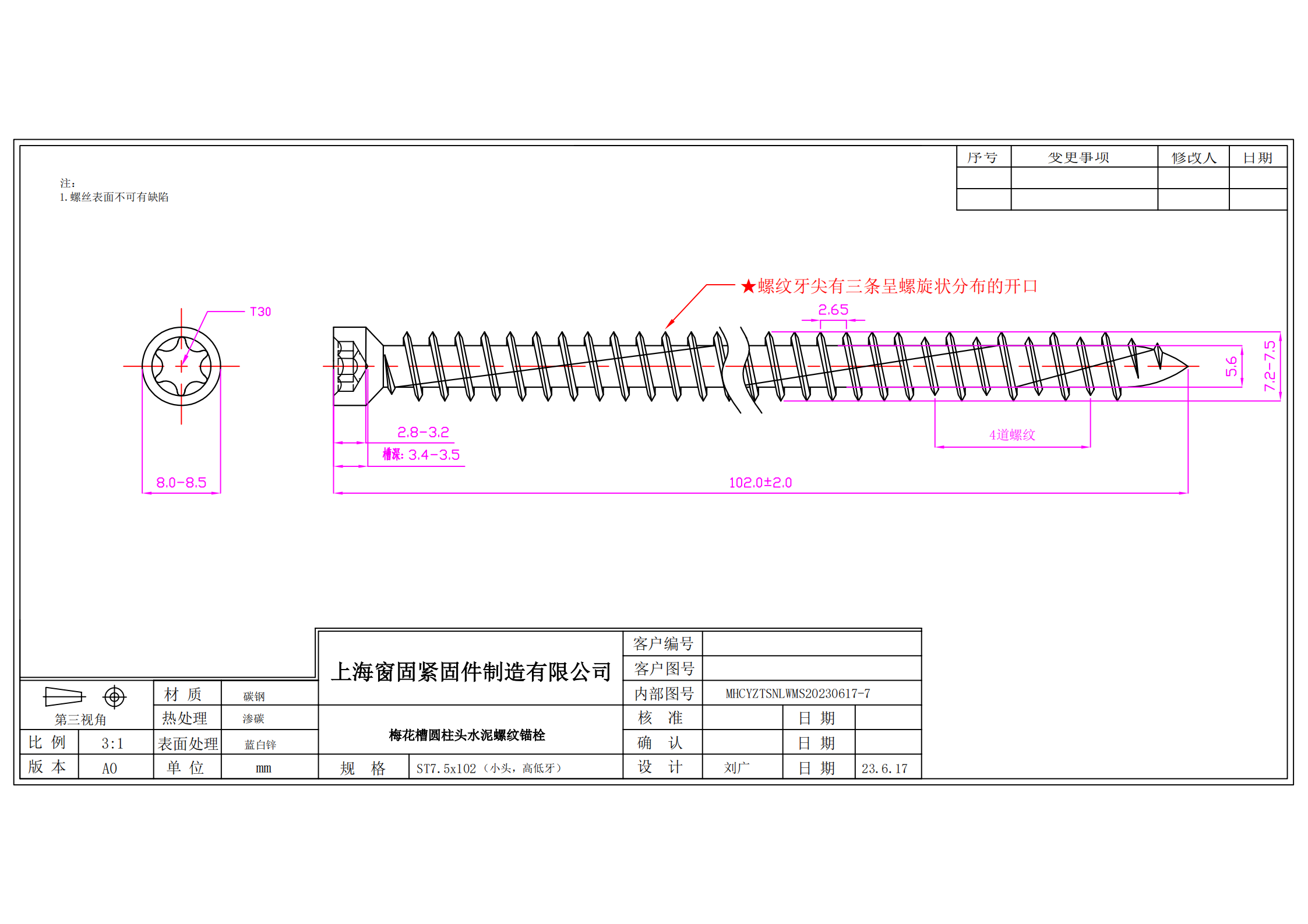 梅花圆柱头水泥螺纹锚栓~7.5*102~五彩锌~(小头高低牙,线径5.6)