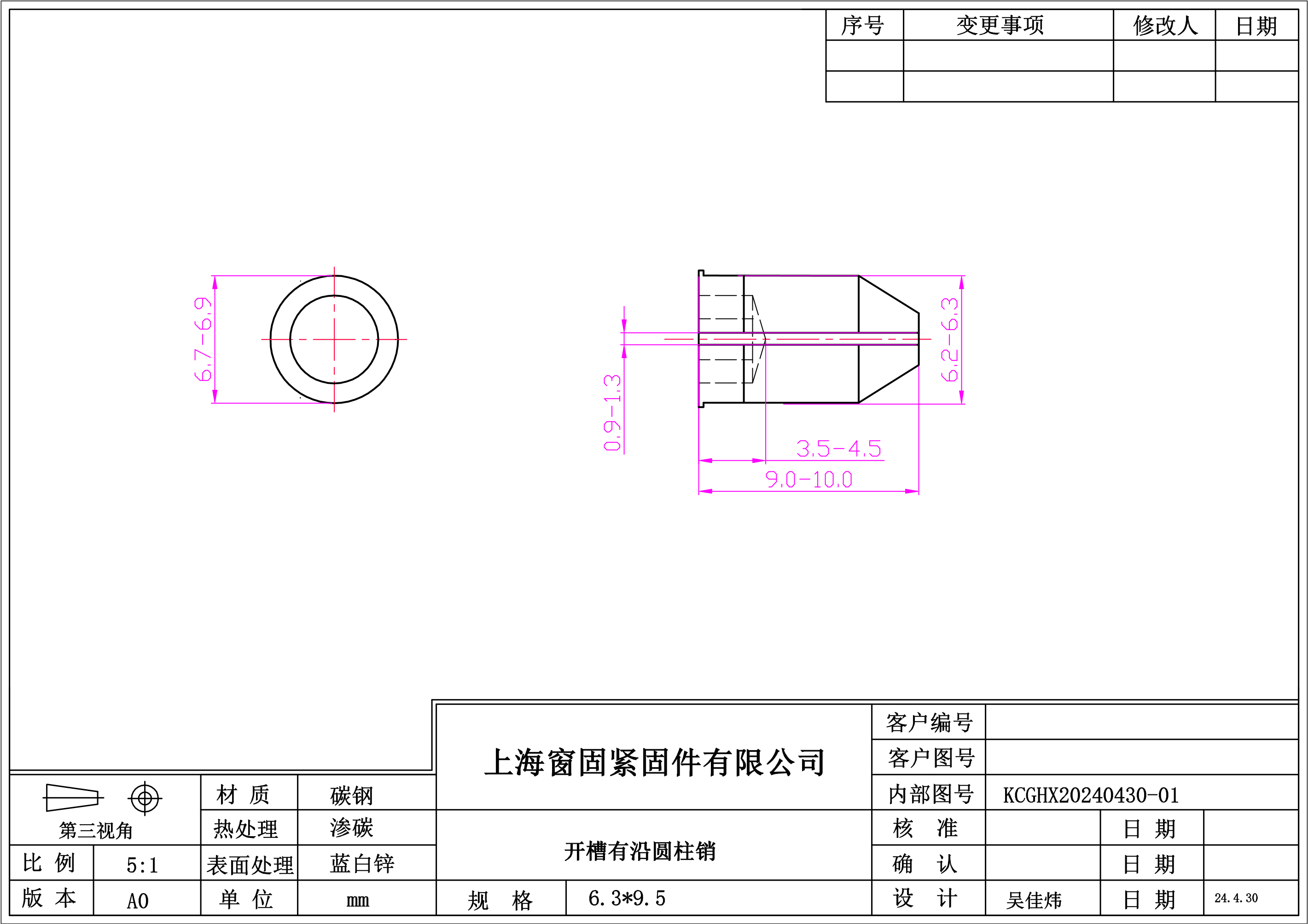 碳钢开槽有沿圆柱销~6.3*9.5~蓝白锌