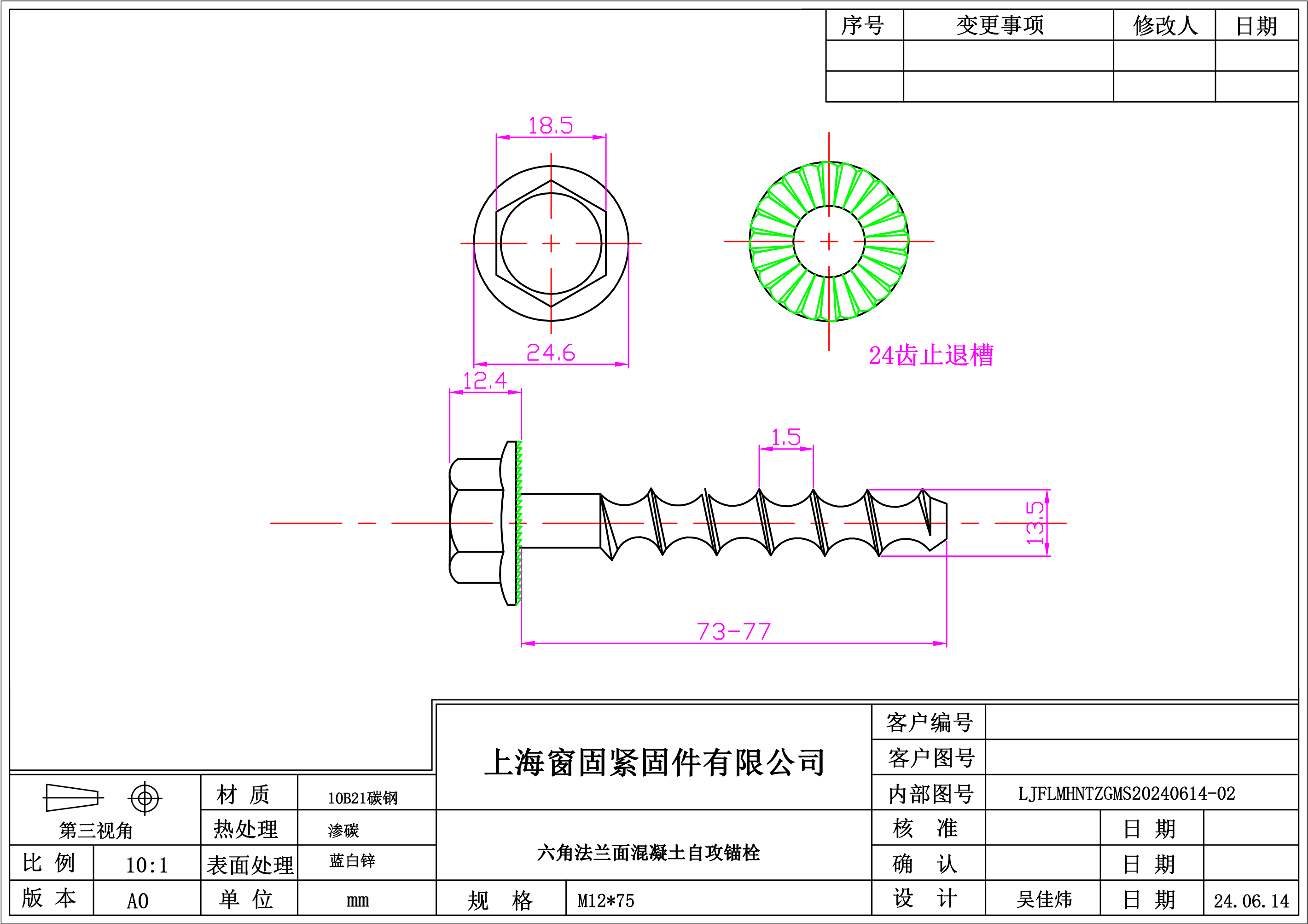 六角法兰面带筋混凝土自切锚栓~12*75~蓝白锌