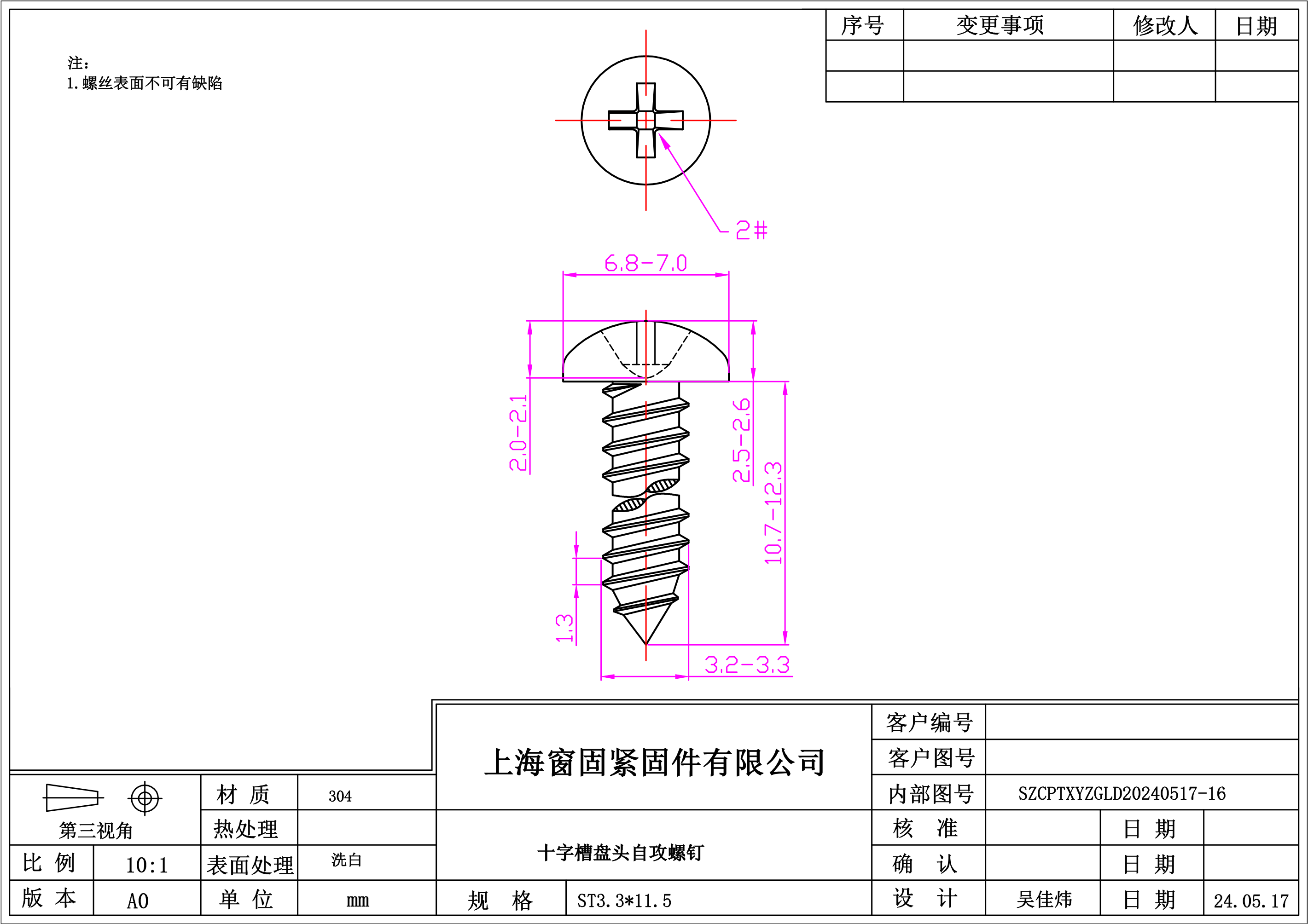 不锈钢304十字盘头自攻螺钉~3.3*11.5~洗白