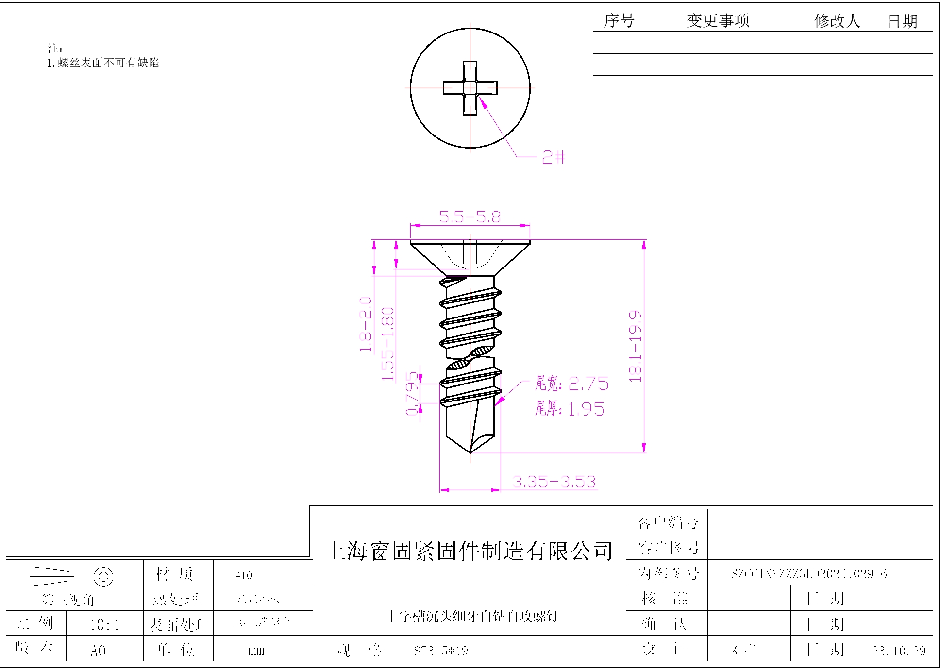 不锈钢410十字沉头细牙自钻自攻螺钉~3.5*19~黑色热锈宝~(槽深1.55-1.8,头径5.5-5.8)