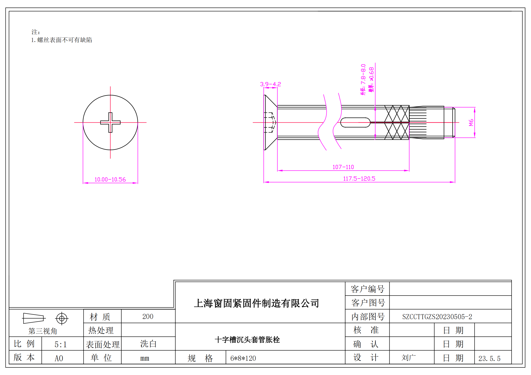 不锈钢200十字沉头套管胀栓~6*8*120~洗白