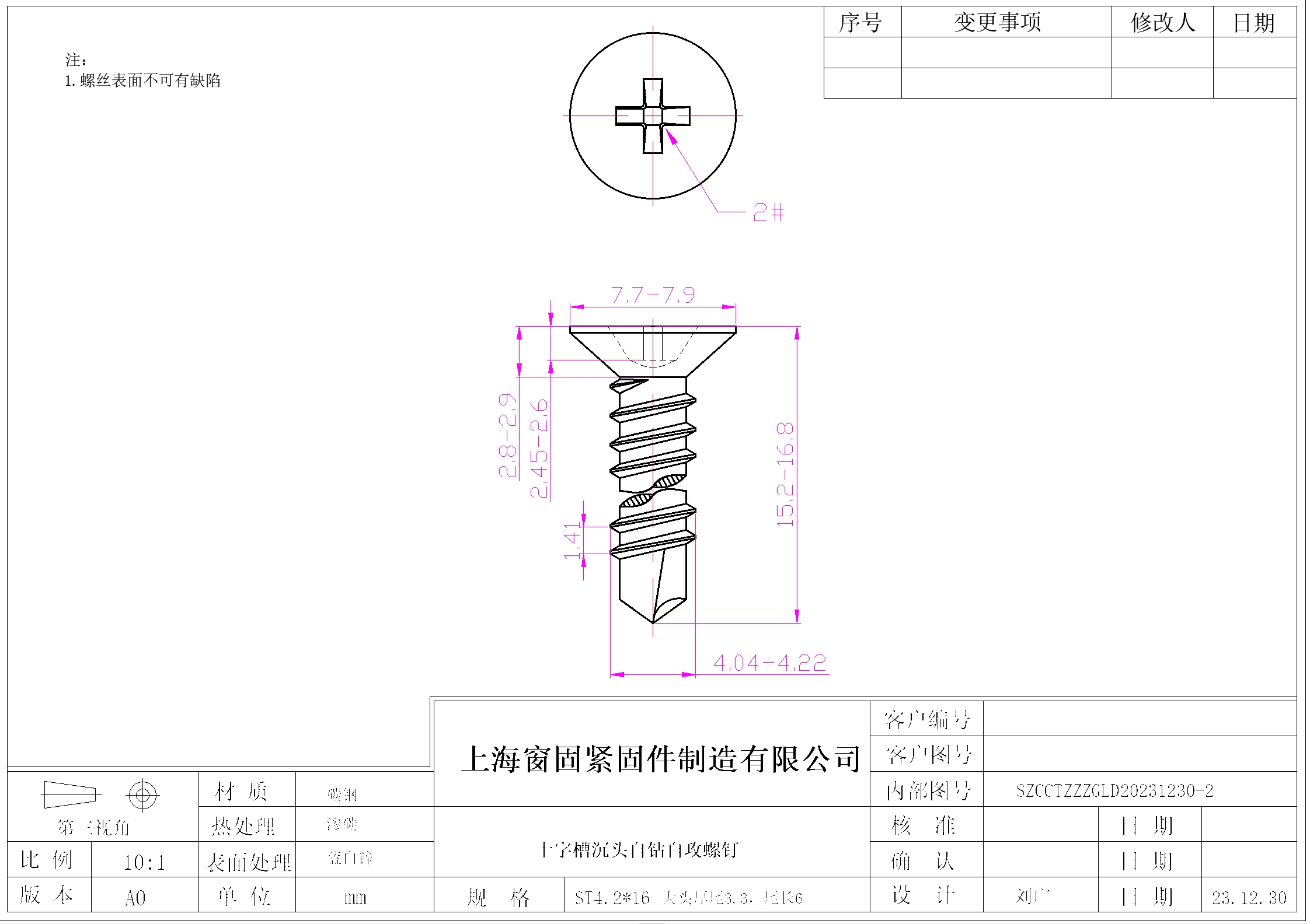 十字沉头自钻自攻螺钉~4.2*16~蓝白锌~(大头厚尾3.3,尾长6)