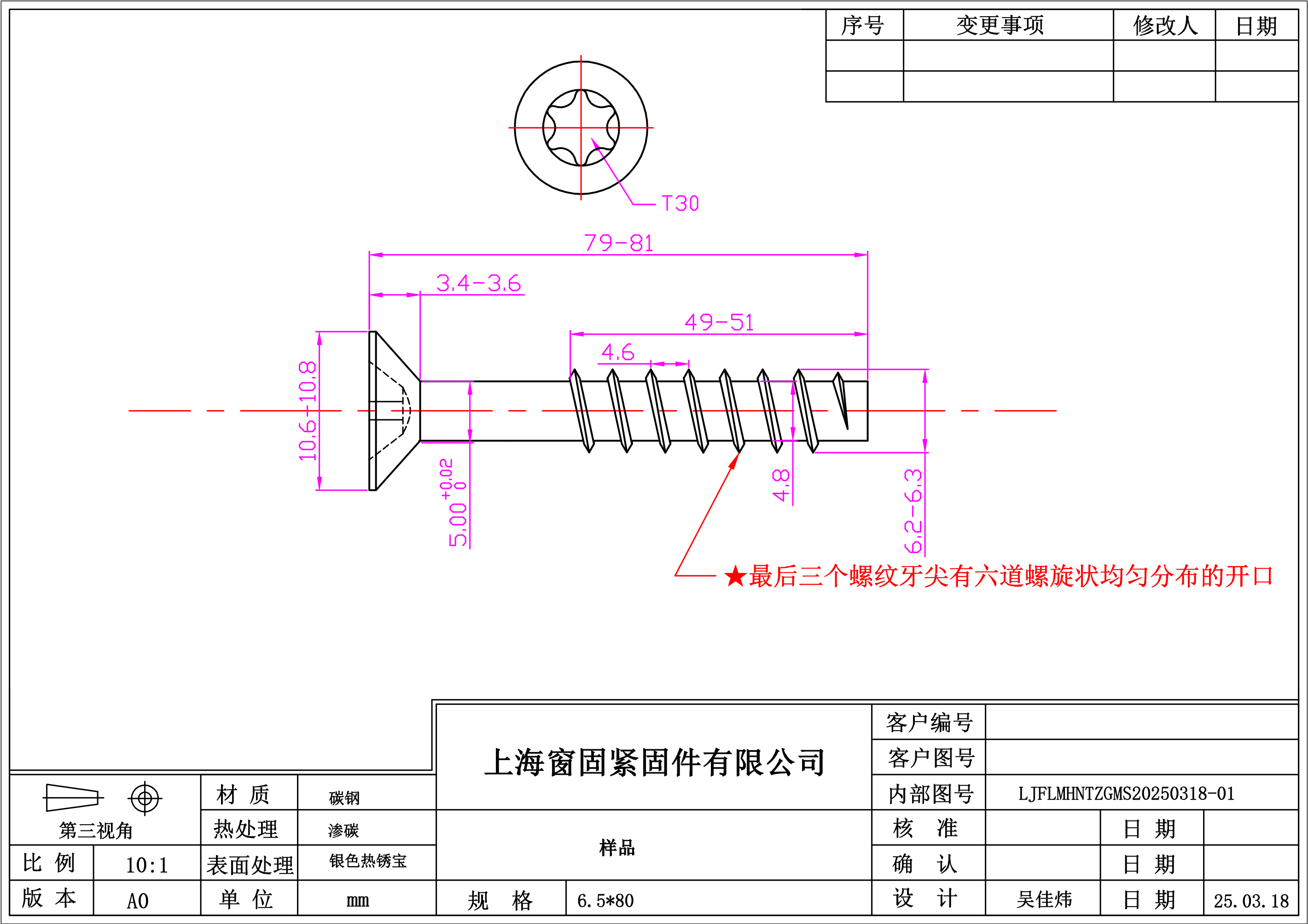 梅花沉头水泥螺纹锚栓~6.5*80~热锈宝~(T30)