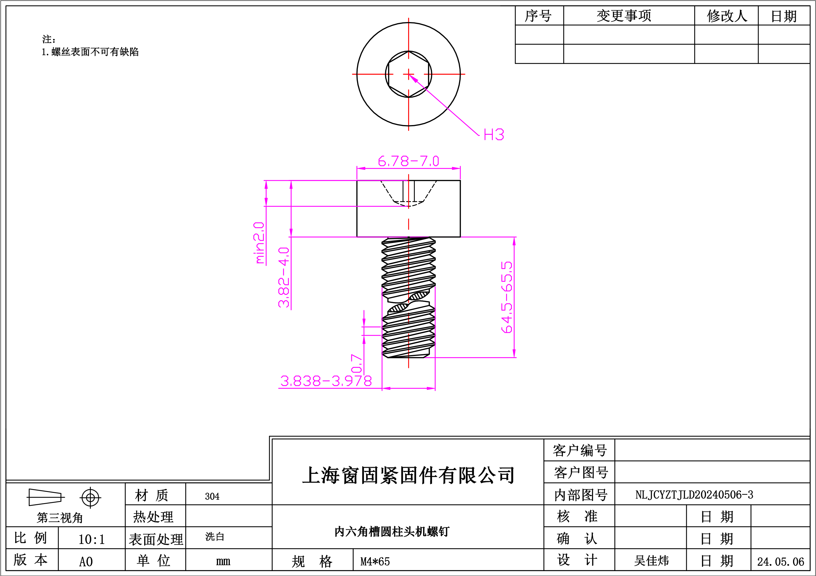 不锈钢304内六角圆柱头机螺钉~4*65~洗白