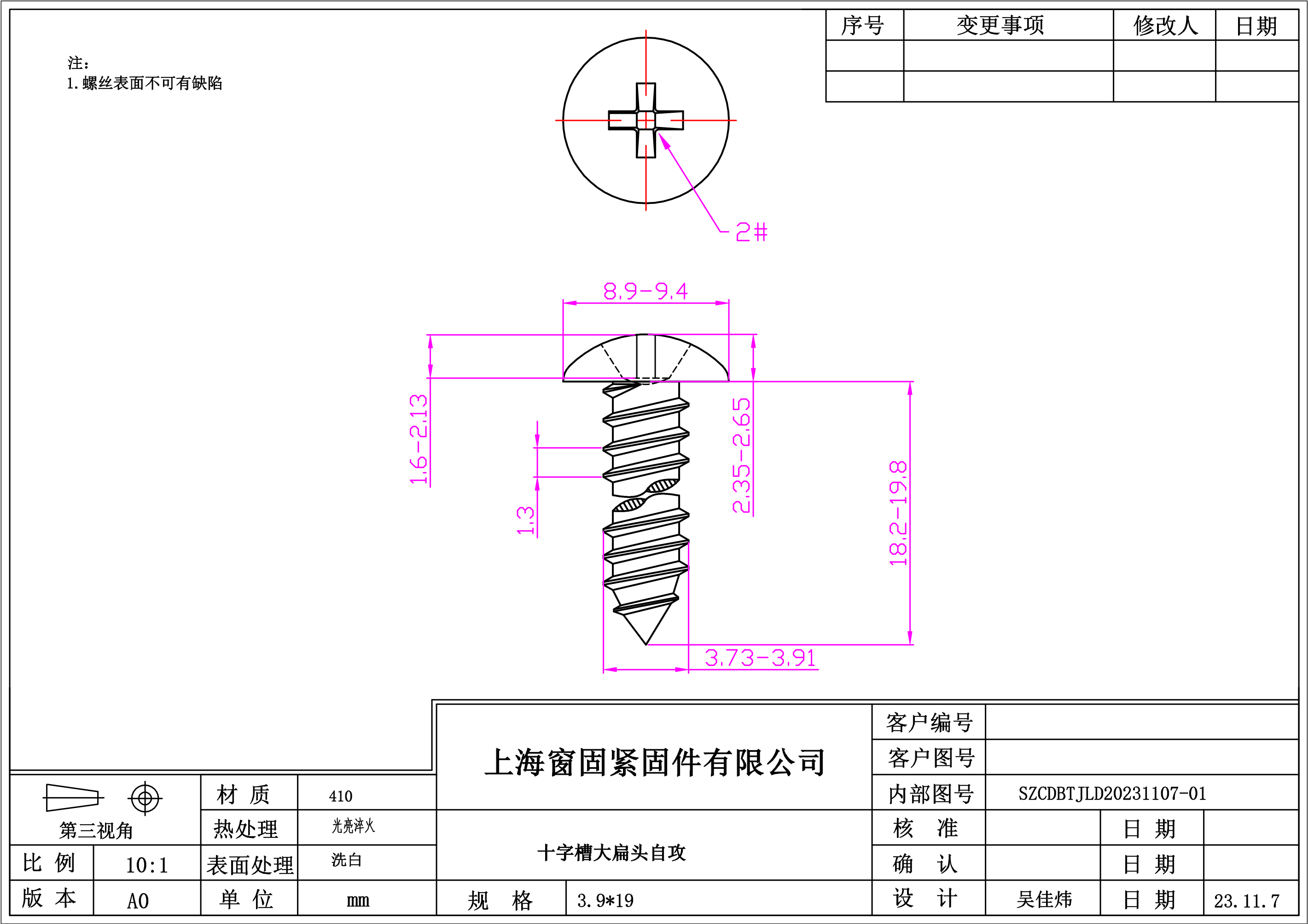 不锈钢410十字大扁头自攻螺钉~3.9*19~洗白