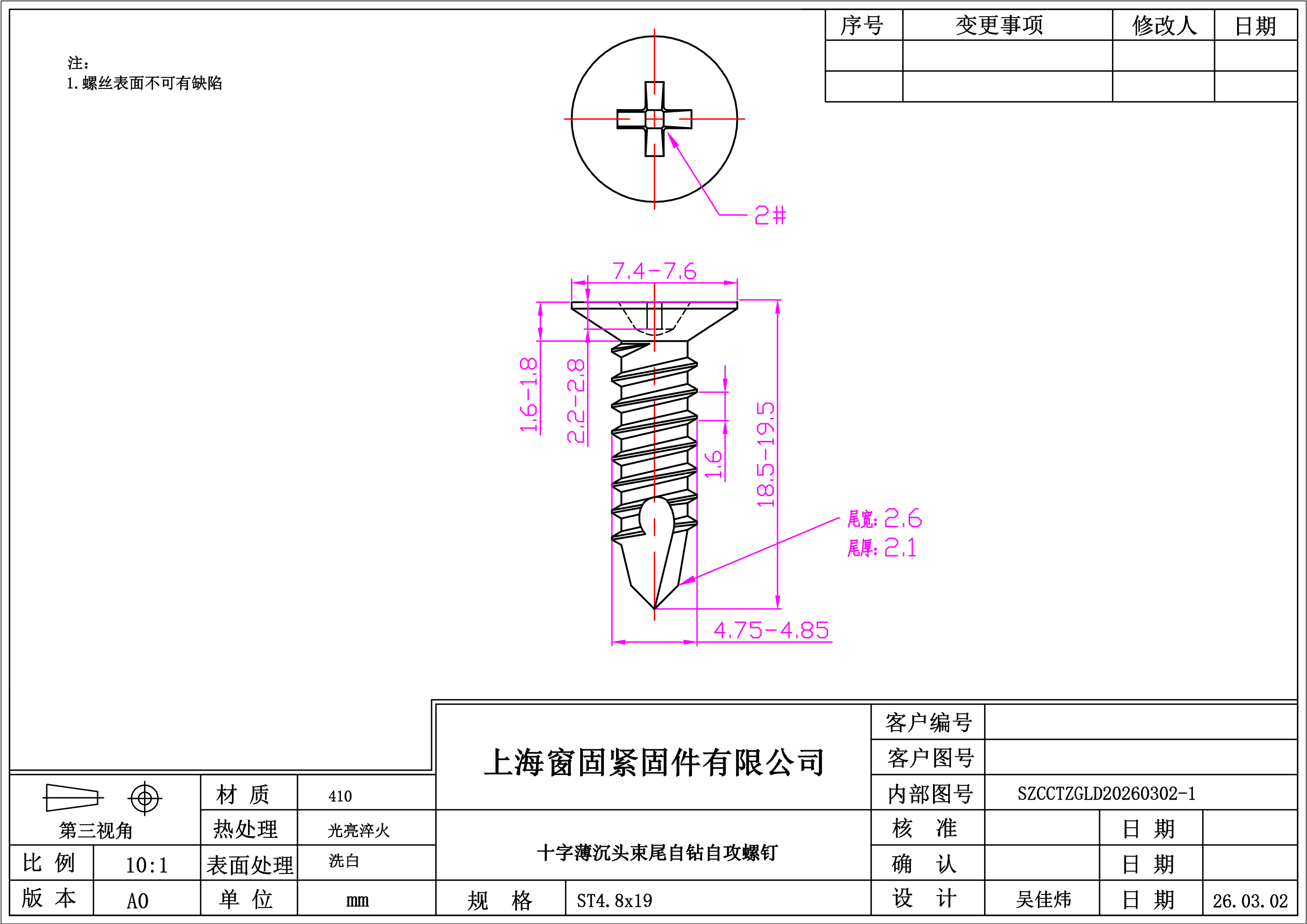 不锈钢410十字薄沉头束尾自钻自攻螺钉~4.8*19~洗白