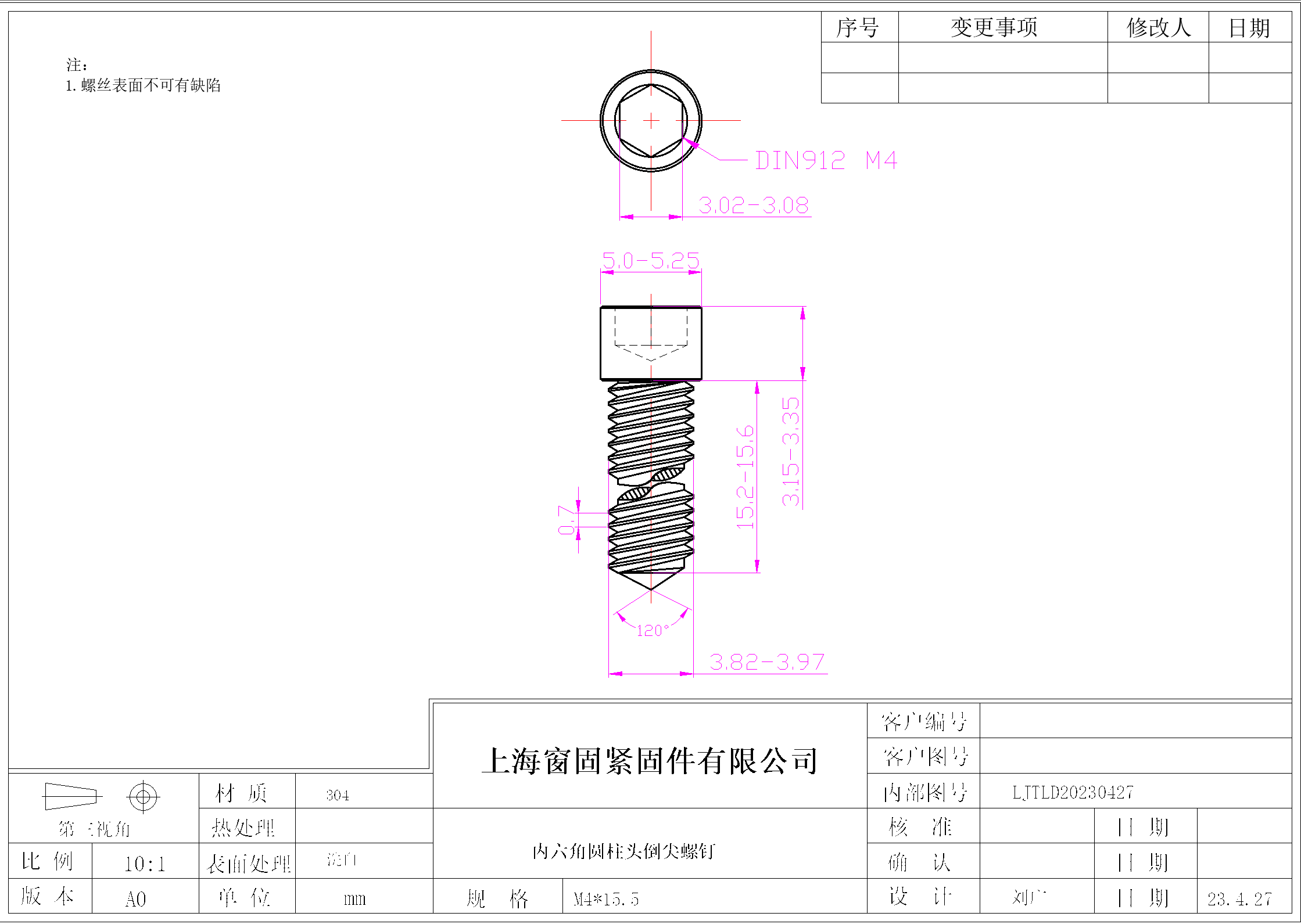 不锈钢304内六角圆柱头倒尖机螺钉~4*15.5~洗白