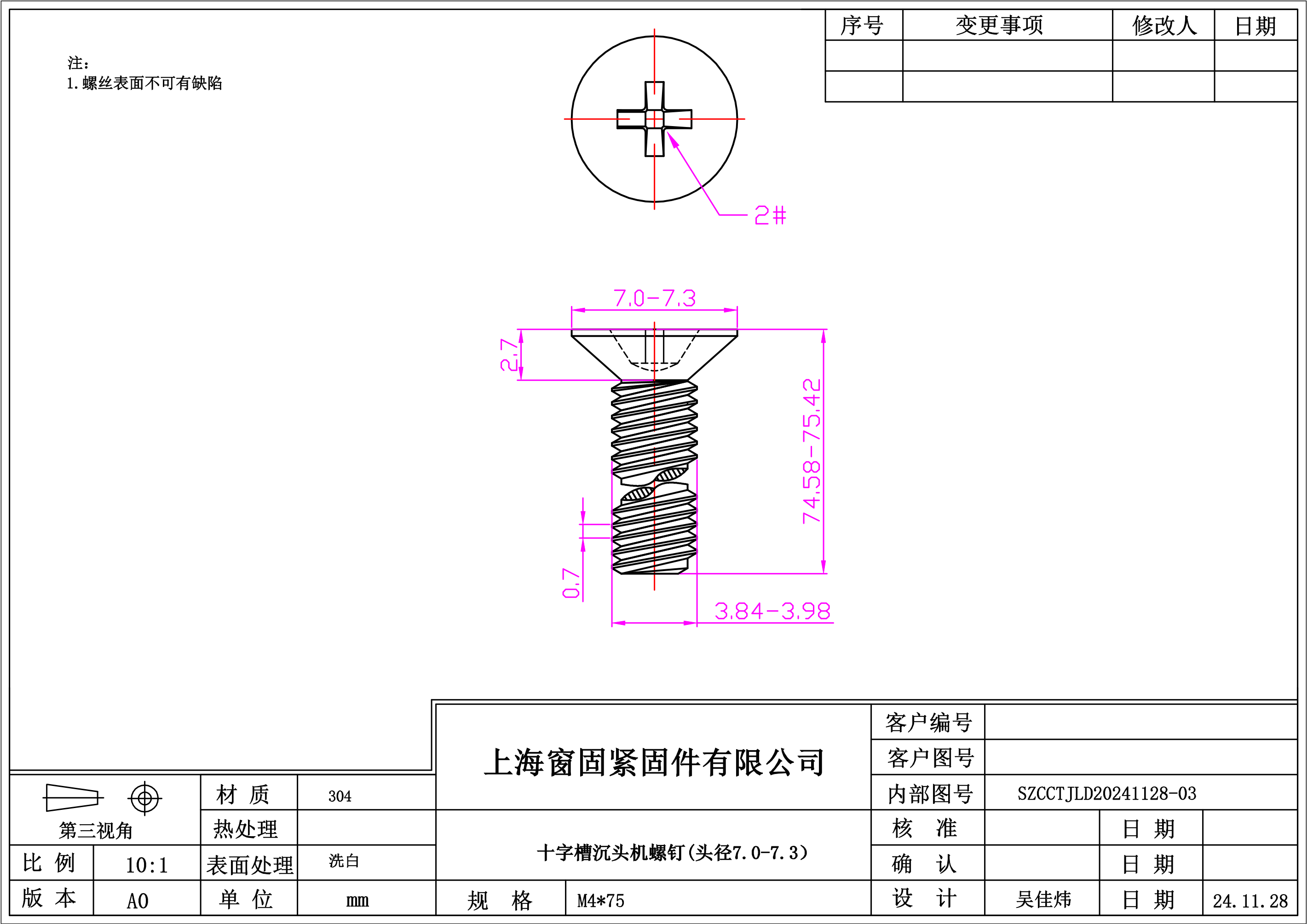 不锈钢304十字沉头机螺钉~4*75~洗白~(头径7.0-7.3)