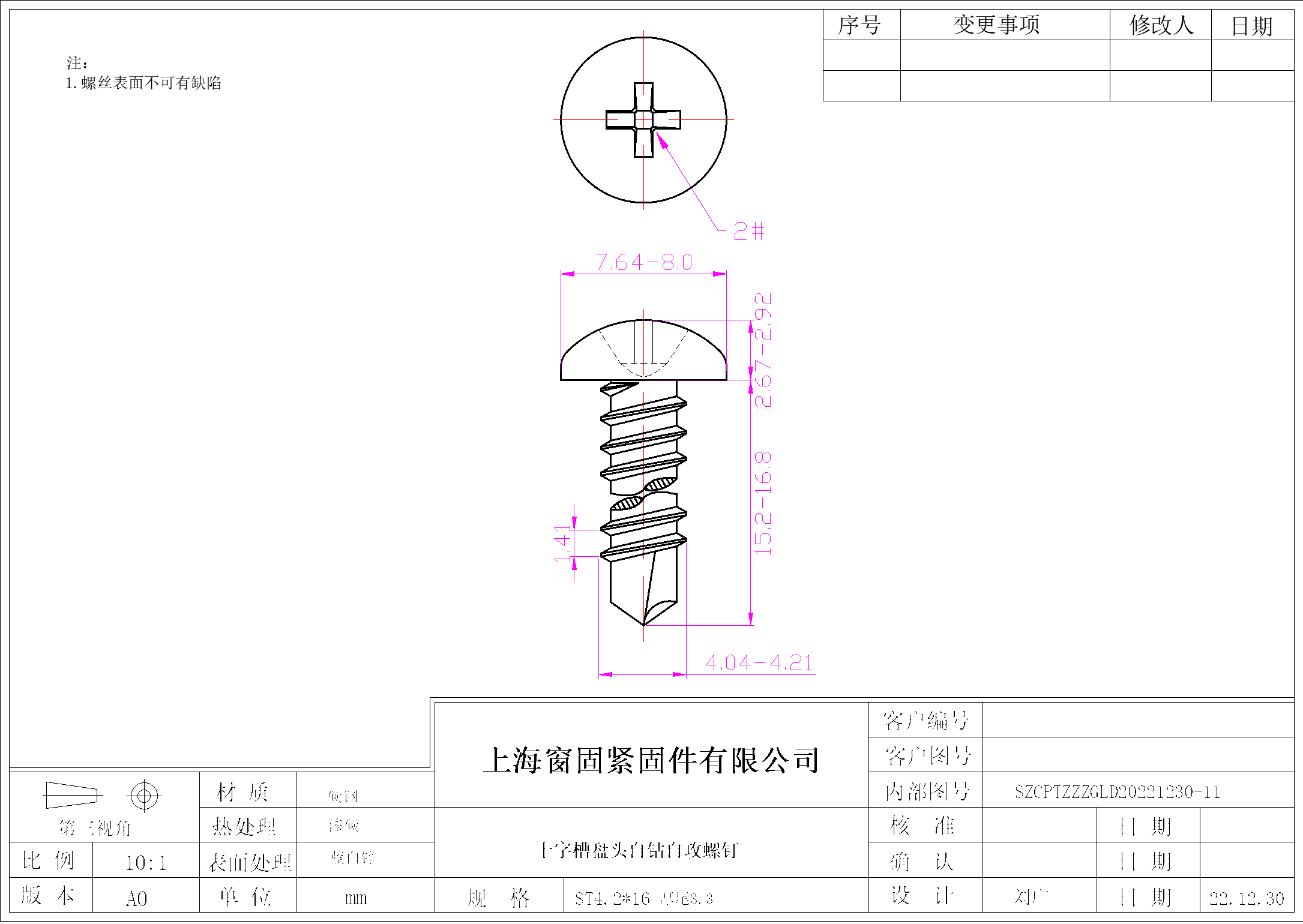 十字盘头自钻自攻螺钉~4.2*16~蓝白锌~(厚尾3.3)