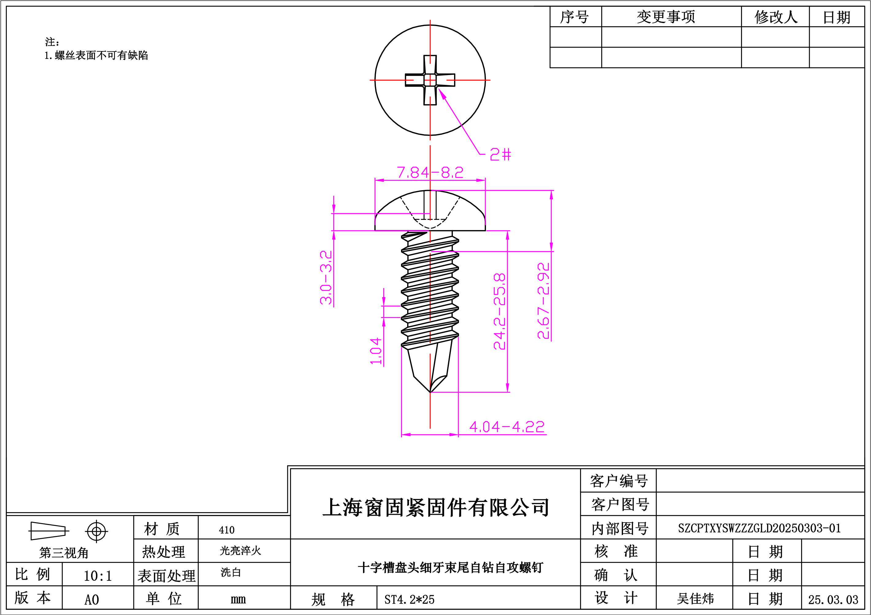 不锈钢410十字盘头细牙束尾自钻自攻螺钉~4.2*25~洗白