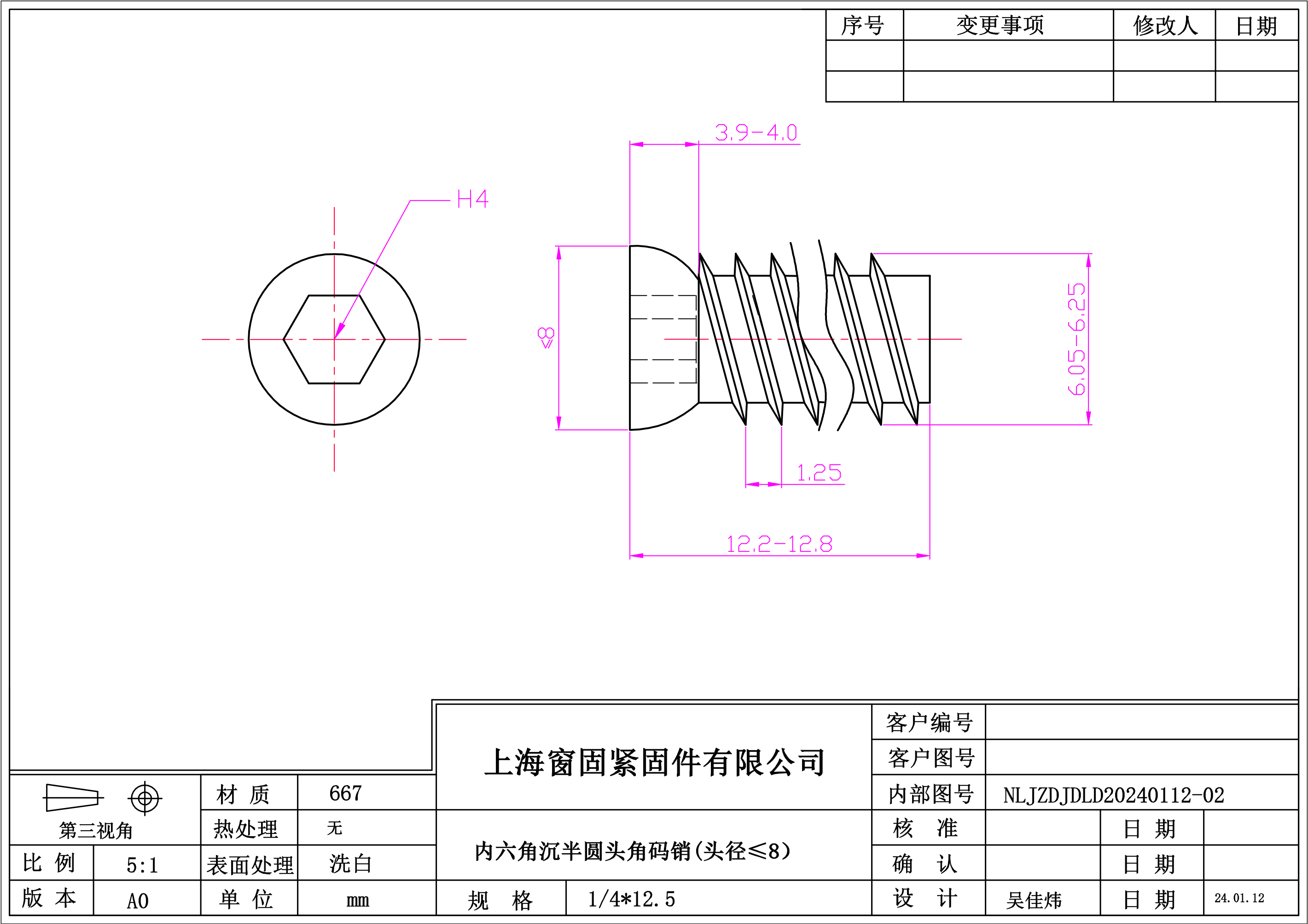不锈钢667内六角沉半圆头角码销~1/4*12.5~洗白~(头径≤8)