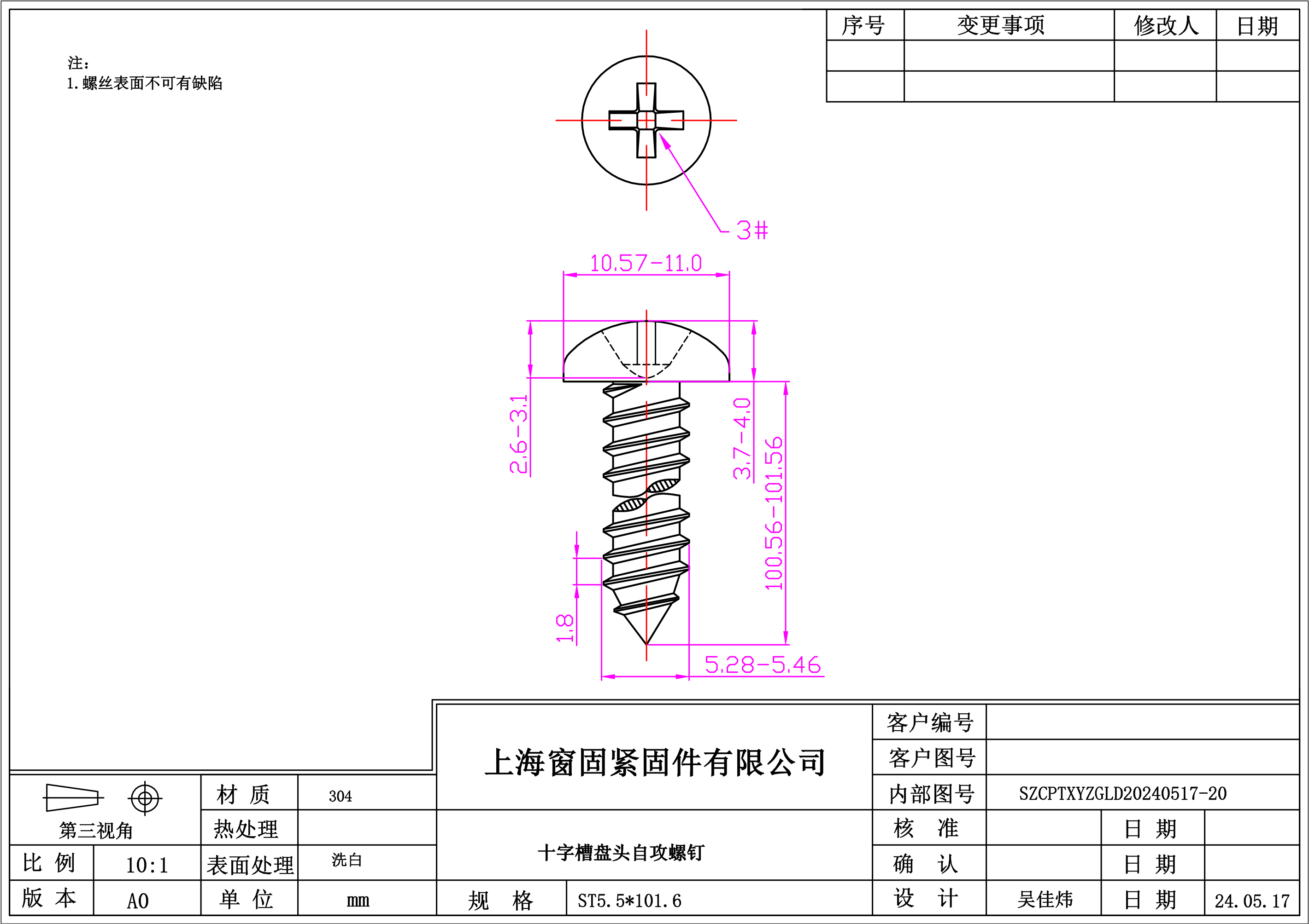 不锈钢304十字盘头自攻螺钉~5.5*101.06~洗白