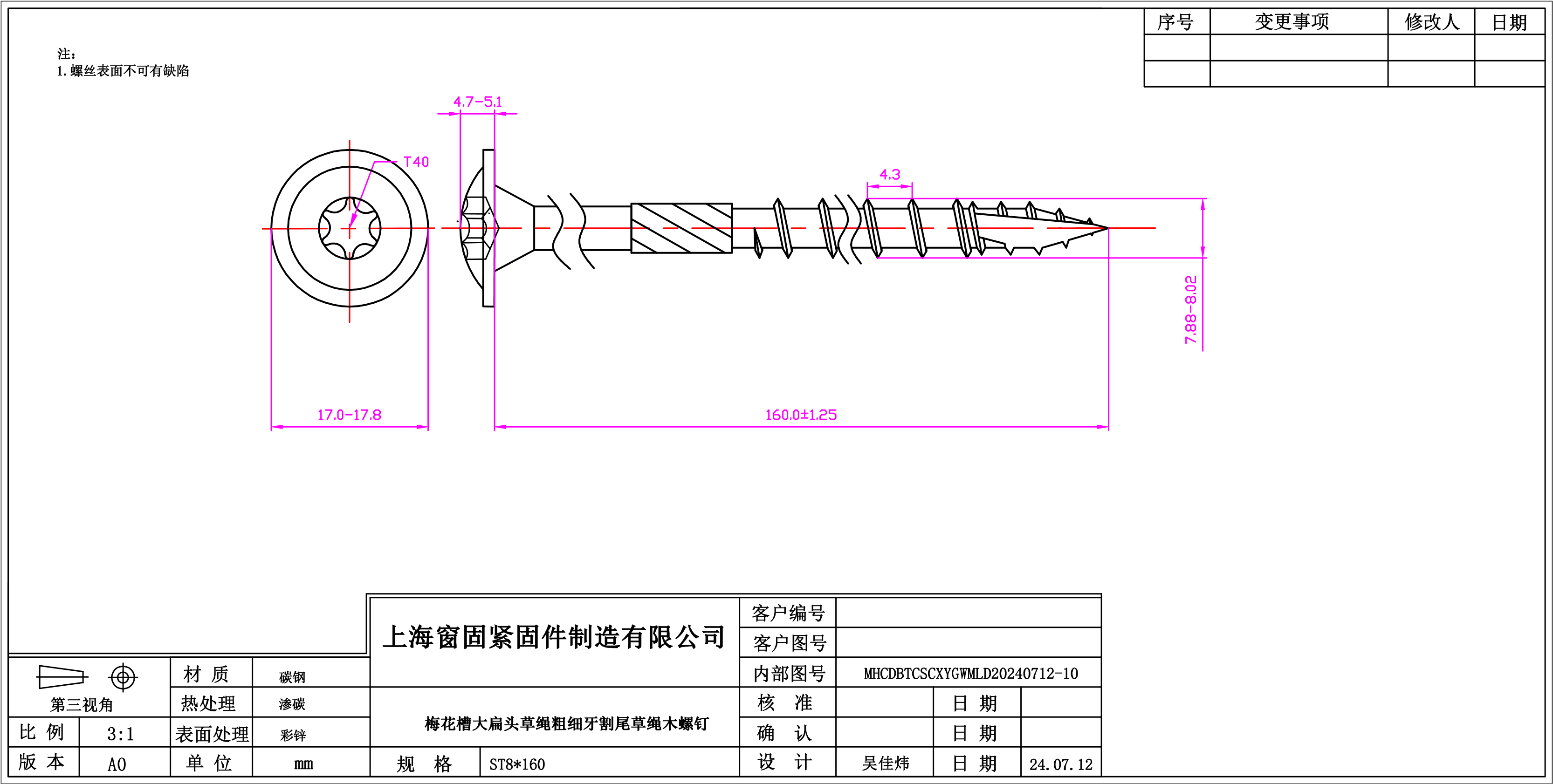 梅花大扁头草绳割尾木螺钉~8*160~五彩锌