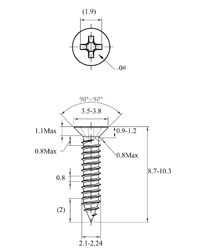 不锈钢304十字沉头自攻螺钉~2.2*9.5~洗白~(外径2.1-2.15,长度9.5±0.3)