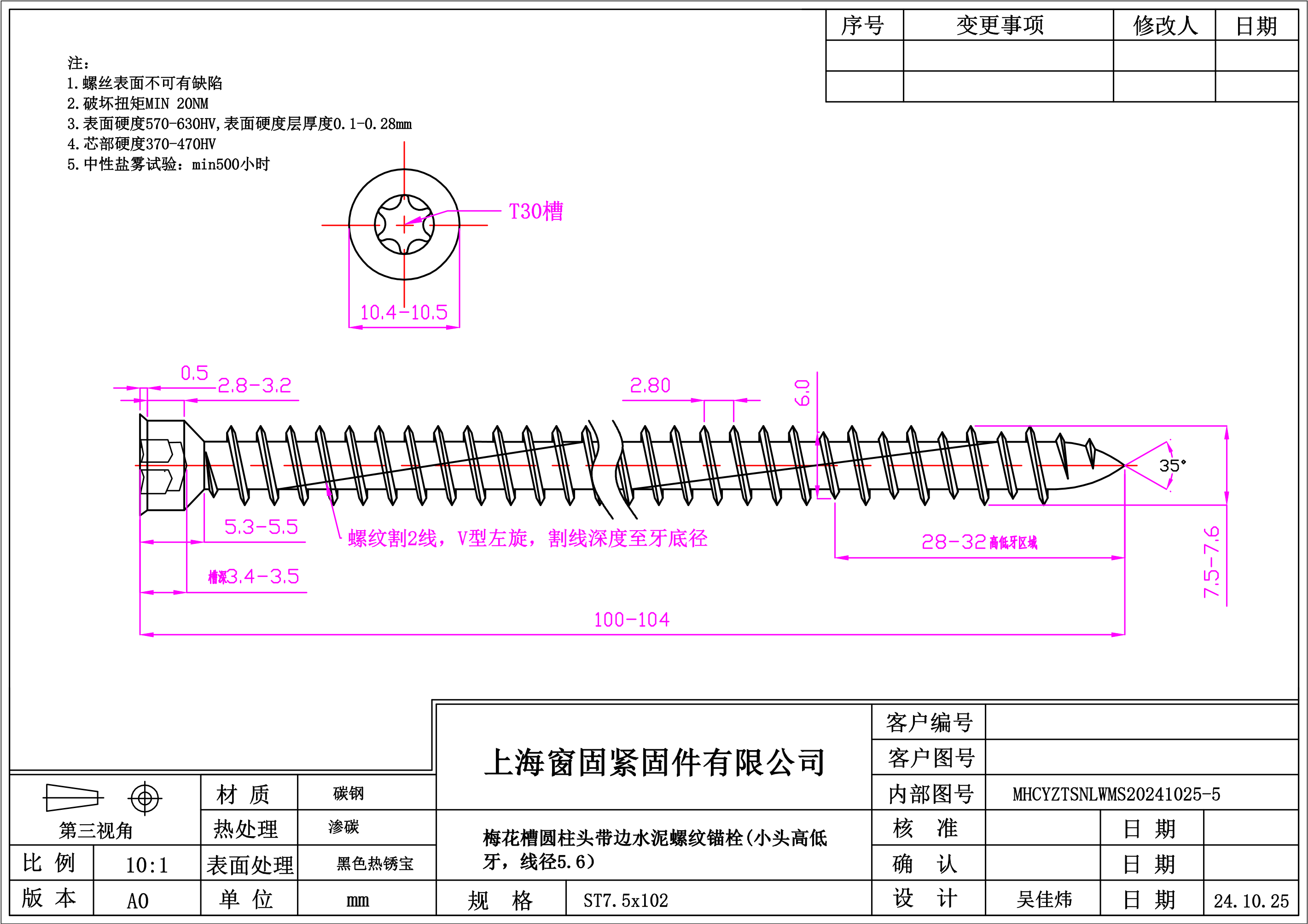 梅花圆柱头带边水泥螺纹锚栓~7.5*102~黑色热锈宝~(小头高低牙,线径5.6)
