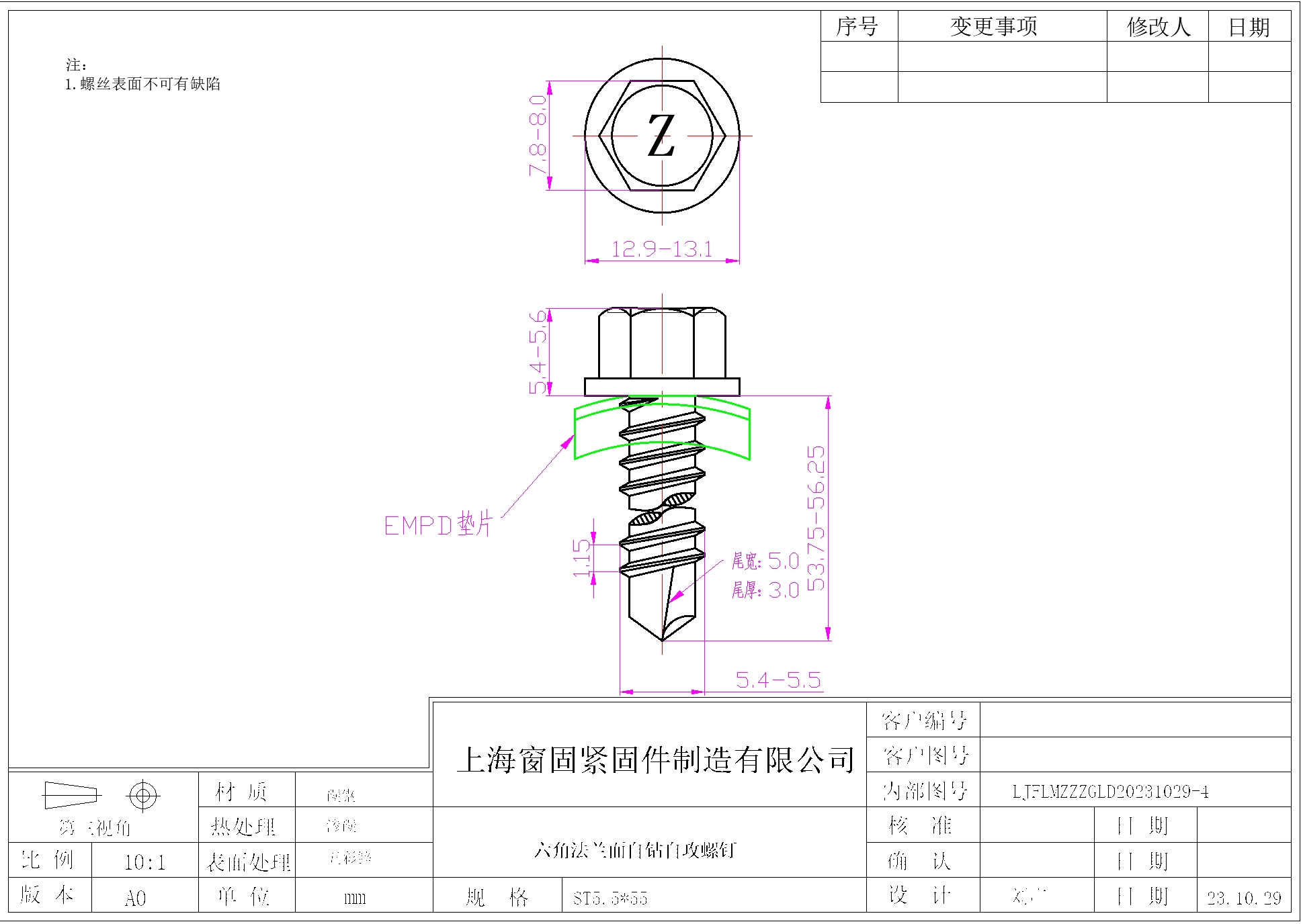 六角法兰面自钻自攻螺钉~5.5*55~五彩锌~(Z标,EPDM垫片)